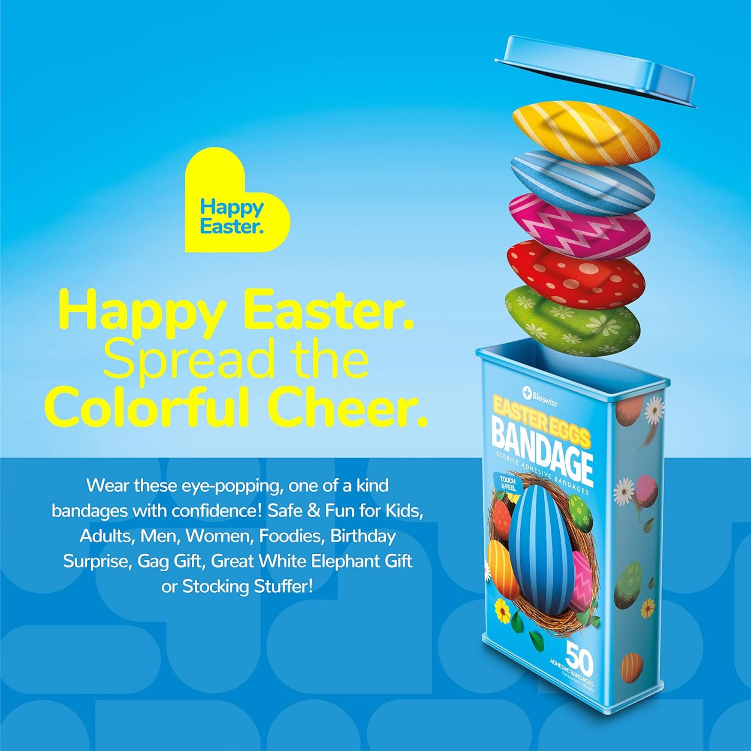 50 EASTER EGG KIDS BANDAGES: Fun Easter egg-shaped adhesive bandages tin helps protect cuts, scrapes, and minor wounds while making healing less stressful for children; bandages come in 5 assorted styles
