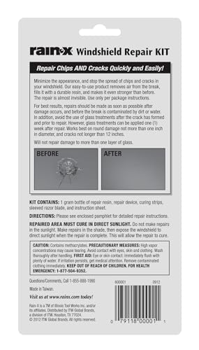 Rain-X Car Windshield Repair Kit helps you minimize the appearance and stop the spread of chips and cracks in your windshield, helping you save time and money, avoiding a full windshield replacement. Rain-X Windshield Repair Kit is easy to use, and only takes minutes to apply. It removes air from the break, fills it with durable resin and makes it even stronger than before. For best results, repairs should be made as soon as possible after the damage occurs and before the break is contaminated by dirt or water. In addition, avoid the use of glass treatments after the crack has formed and prior to repair. However, glass treatments can be applied one (1) week after repair. The kit works best on round damage not more than one inch in diameter, and cracks not longer than 12 inches. It will not repair damage to more than one layer of glass. Pro-tip to avoid poor results - refrain from applying resin too quickly, air pockets forming during the application or repairing a contaminated crack as this may compromise your results.