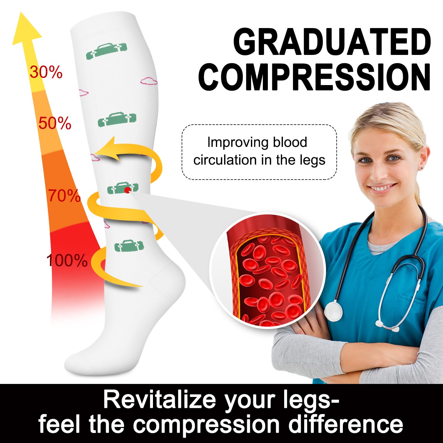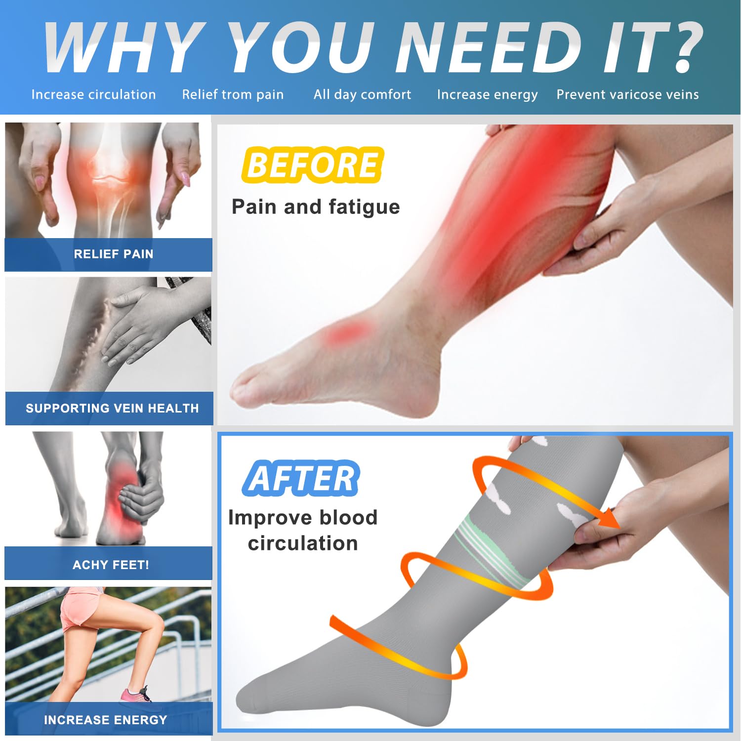 🆕【ENERGIZE YOUR LEGS】-- Compression socks have been shown to help decrease swelling and pain in the legs and ankles. Graduated compressions' whole purpose is to increase circulation, thus improving energy levels in the body. Another benefit of improving circulation is decreasing swelling and fluid retention. Increased circulation decreases swelling and increases blood flow, this reduces the feeling of heavy and achy legs.