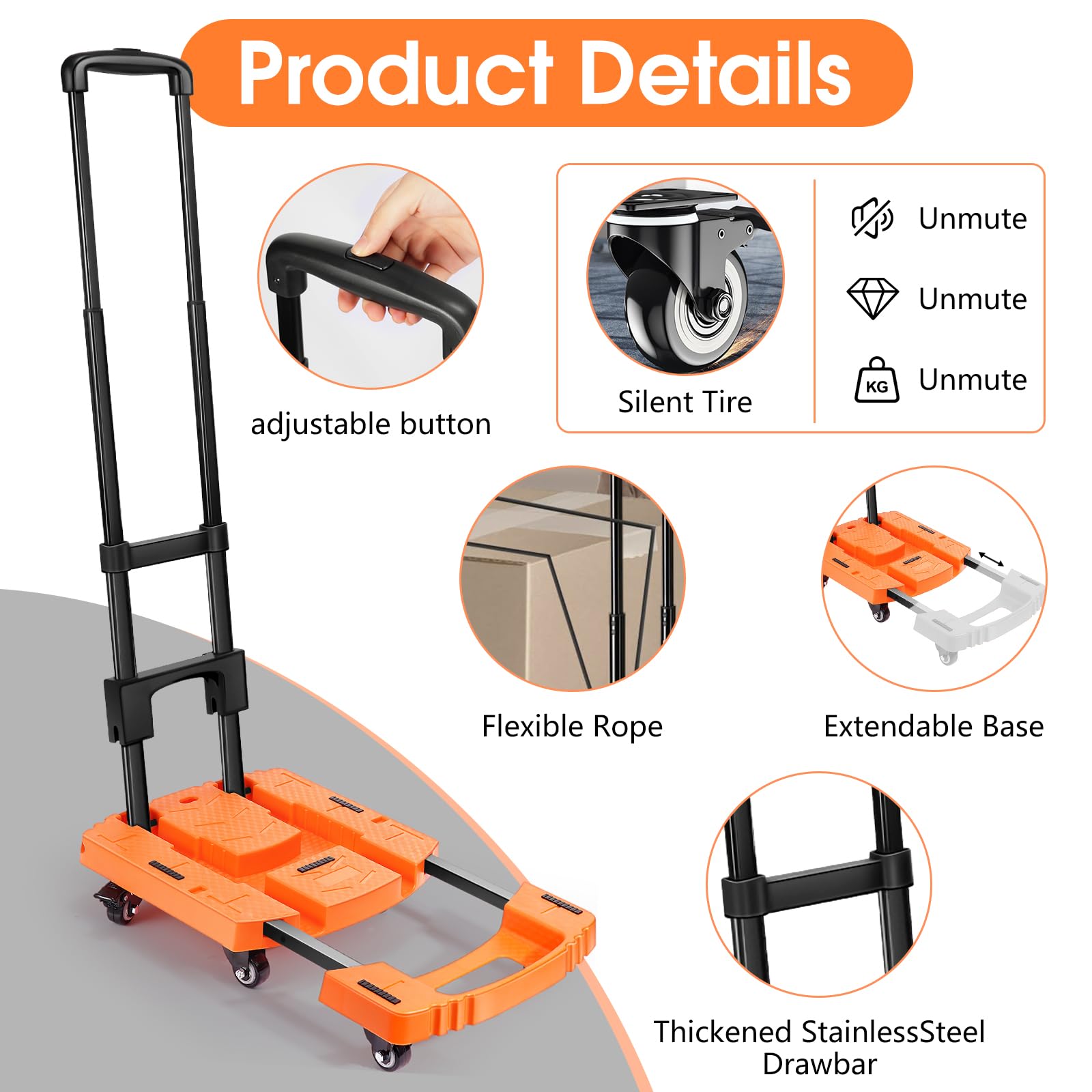 **Adjustable Platform + 2 Elastic Ropes**: The dolly cart has an adjustable platform that can fit items of various sizes and comes with two elastic ropes for securing items during transport, adding flexibility and convenience