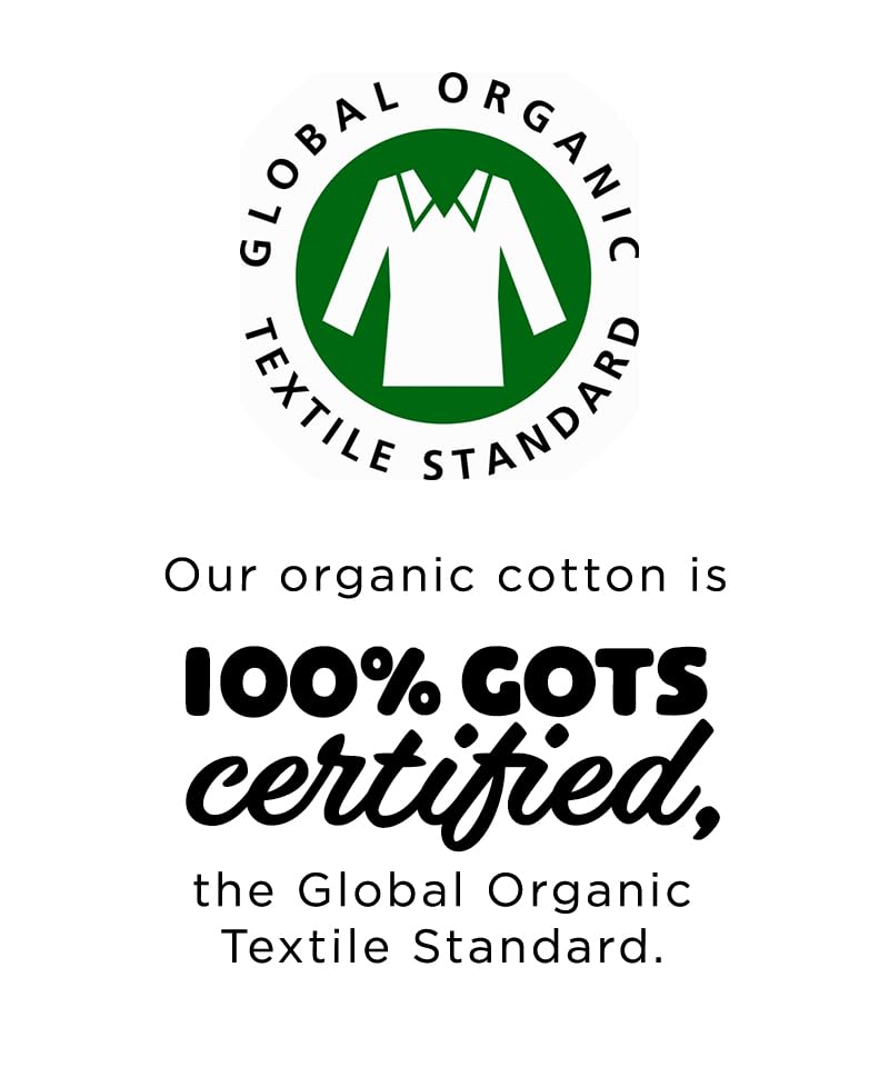 GOTS CERTIFIED ORGANIC: We use 100% luxuriously soft organic cotton, certified by GOTS international, the Global Organic Textile Standard. Our line is grown and manufactured in India.
