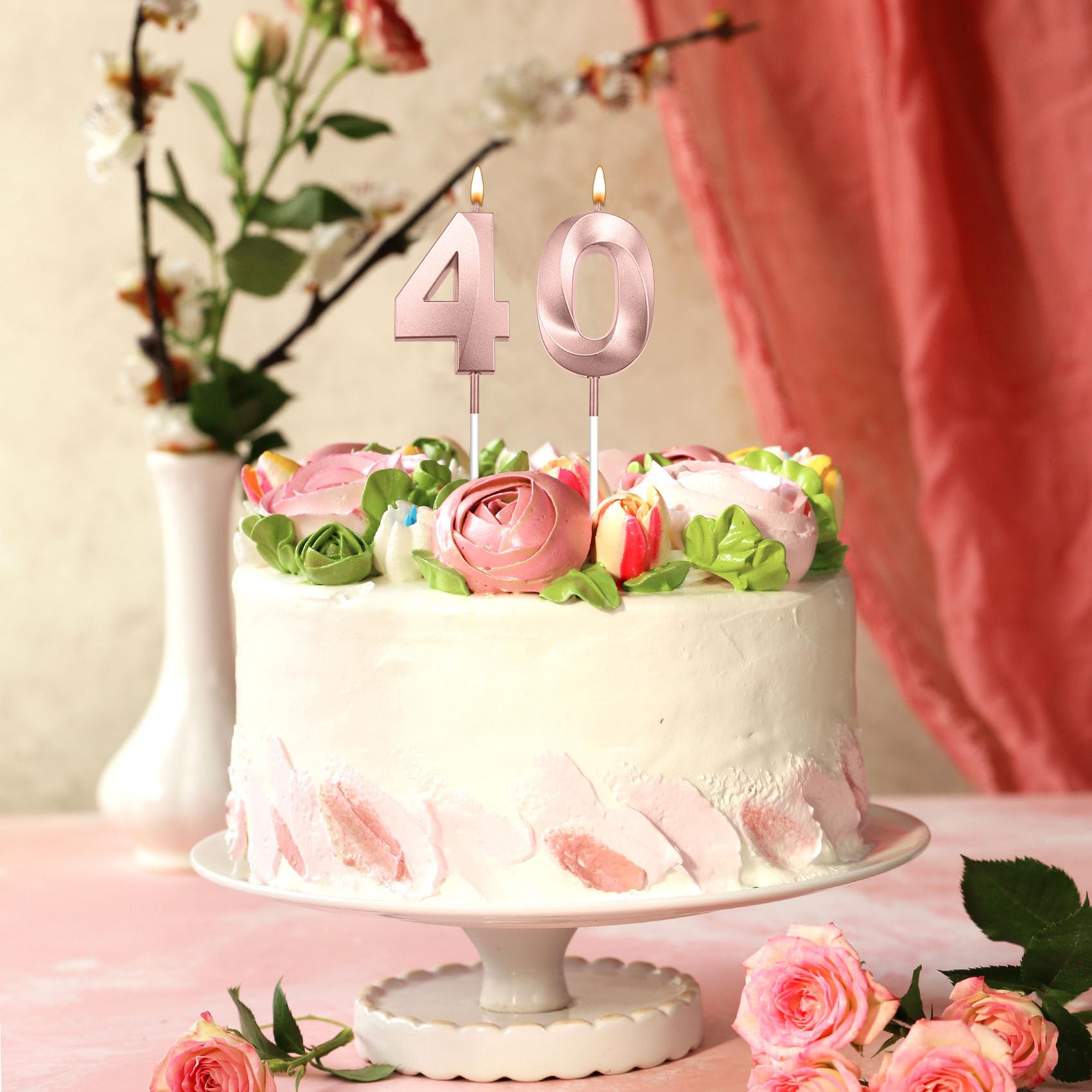 Vibrant 3D 40 candles for cake: Package contains two matte-rose gold birthday candles for cake —featuring number 4 candle and number 0 candle —that together form a sparkling "40" or "43" display. In low lighting, 40 cake topper add a elegant glow, making them perfect for decorating cake, cupcakes, and desserts. A wonderful way to help create memorable birthday moments. number birthday candles 40th birthday gifts for women 40 birthday decorations for him happy 40th birthday party favors
