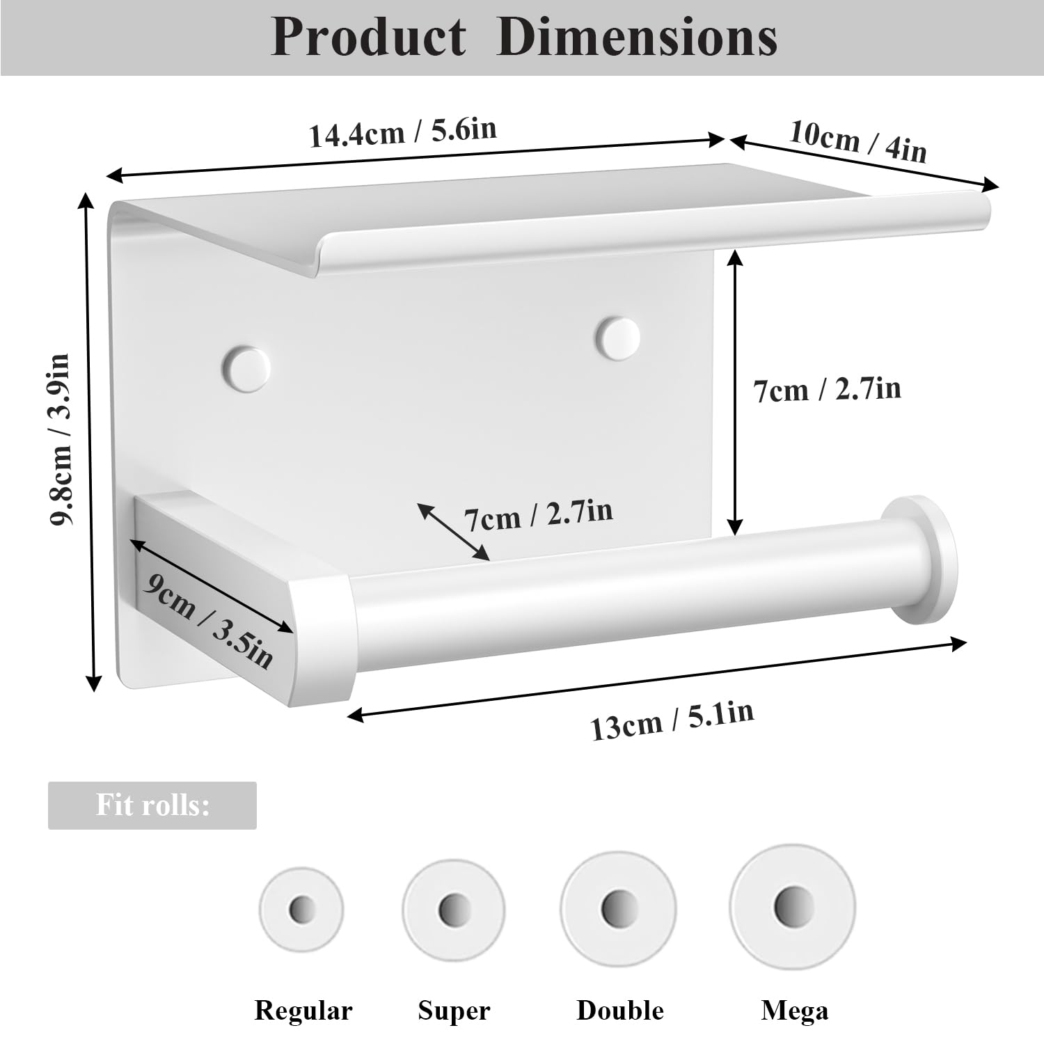 LARGE & SAFE PHONE SHELF: Front folding edge of toilet paper holder with storage prevents phone or other stuff from falling off, the phone shelf is large enough to hold various items, such as iPhone Max, bluetooth speaker, wet wipes or air freshener etc. This stick on toilet paper holder stand fits most of size paper rolls.