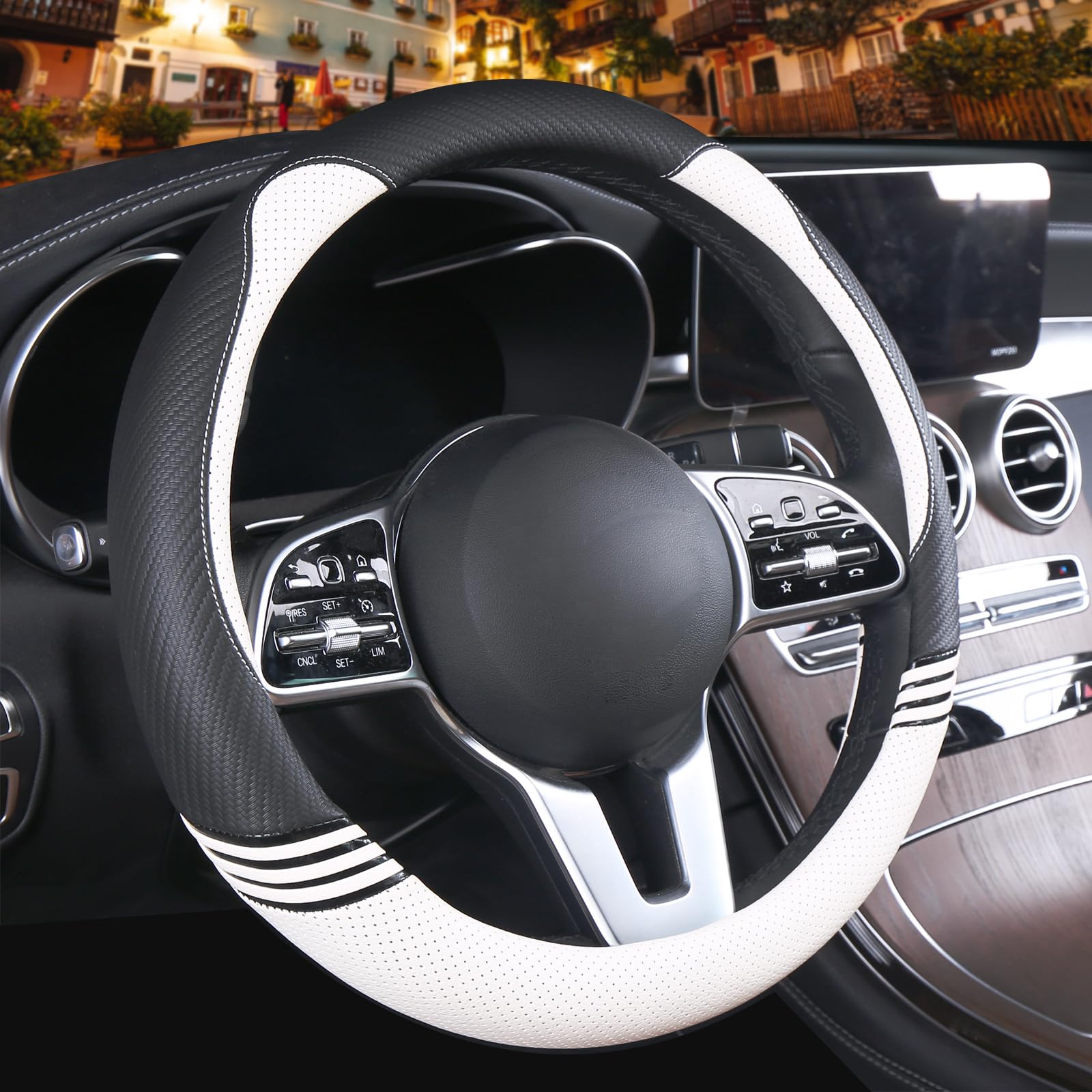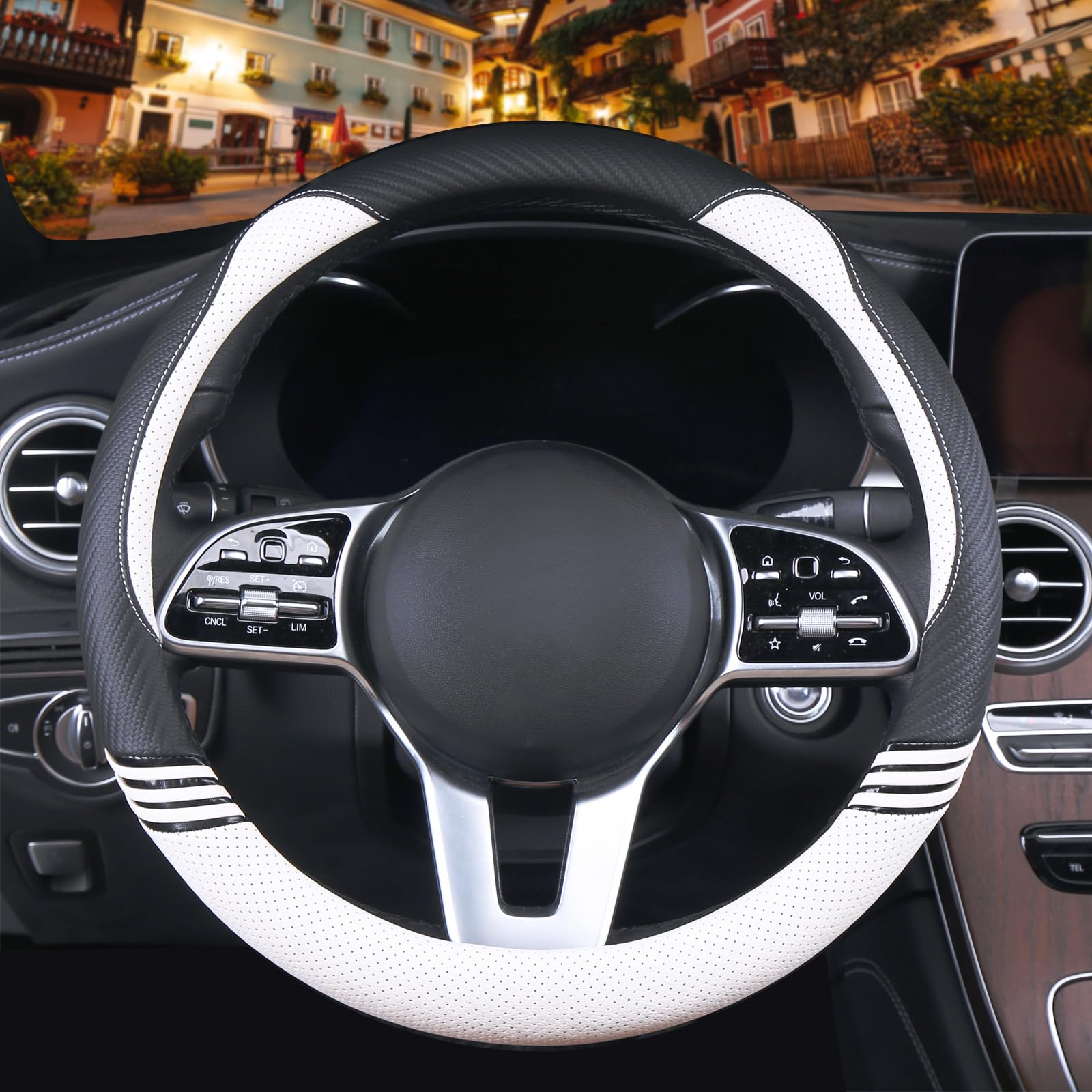 [FOR ALL SEASONS] - This steering wheel cover is crafted from a combination of soft, breathable leather and premium carbon fiber material. It offers heat resistance, cold resistance, and abrasion resistance, ensuring more stable temperature performance. Available all year round, eliminating the hassle of replacement.