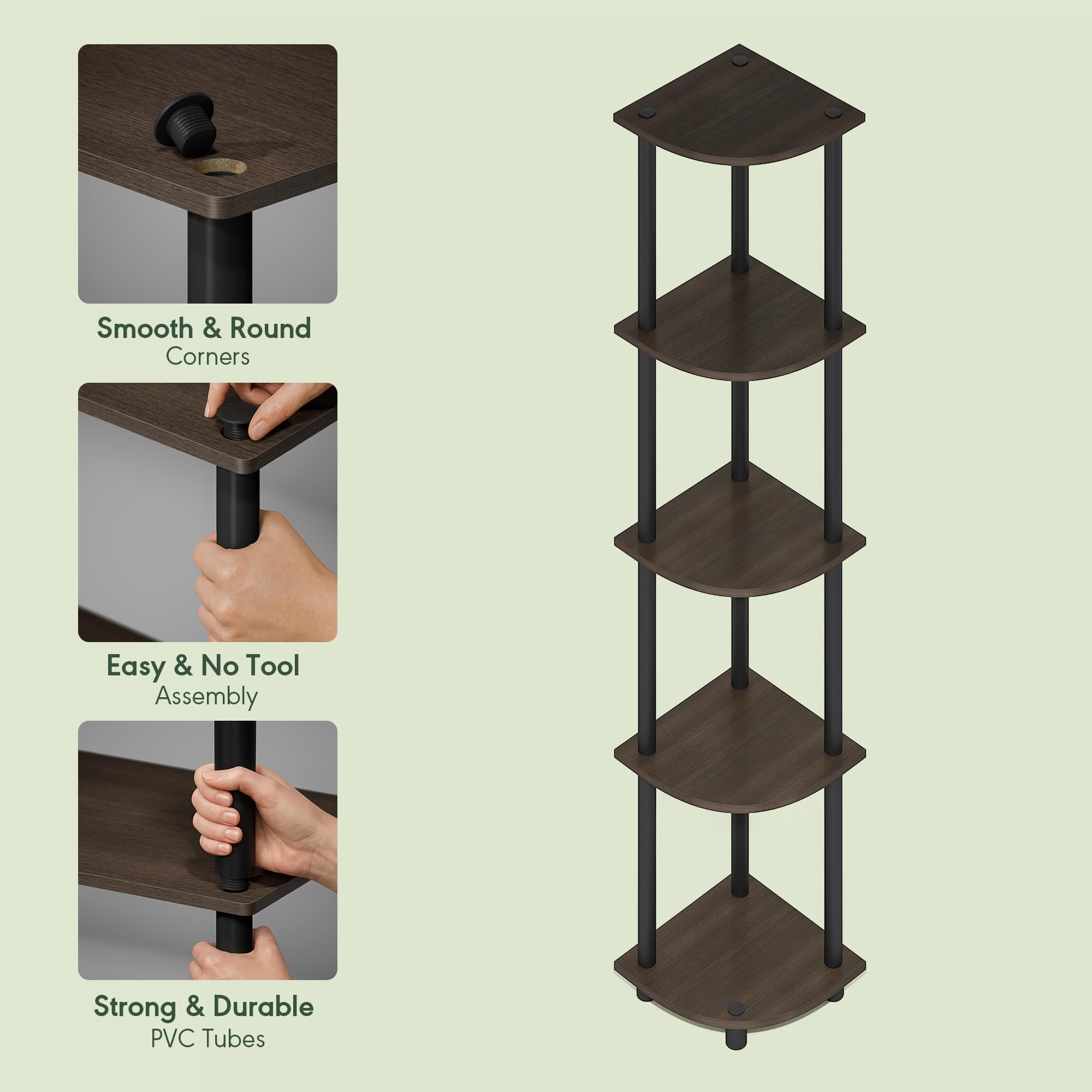Maximize your corner space with the Furinno TURN-N-TUBE 5 Tier Corner Shelf, offering a compact vertical design ideal for displaying books, décor, plants, and everyday essentials. Its sturdy tubular frame and engineered wood shelves provide reliable support, while the open-shelf design allows easy access and an airy look that complements any room. Perfect for living rooms, bedrooms, or offices, this versatile unit adds both functionality and style to unused corners. The corner shelves is made of CARB-grade composite wood, tested for durability and sturdiness to ensure reliable everyday use. Assembly is quick and simple with the provided step-by-step instructions. For care, wipe clean with a dry cloth and avoid using harsh chemicals to preserve the finish. Pictures are for illustration purposes only, and all décor items are not included in this offer. The product is entitled to a 1-year warranty against manufacturer defects. Fits Space, Fits Budget.