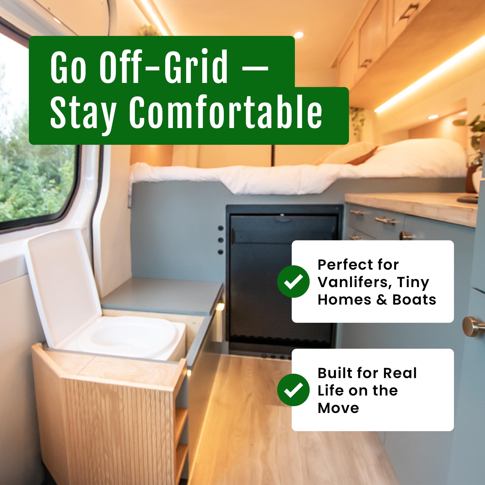 Built for Off-Grid Simplicity & Low Maintenance - Operates on 12V power (cable included) and continues working without electricity when needed. No water or chemicals required. External venting is optionalโnot necessary for use thanks to the integrated fan and filter system. A simple, low-maintenance solution for independent living, wherever you go.