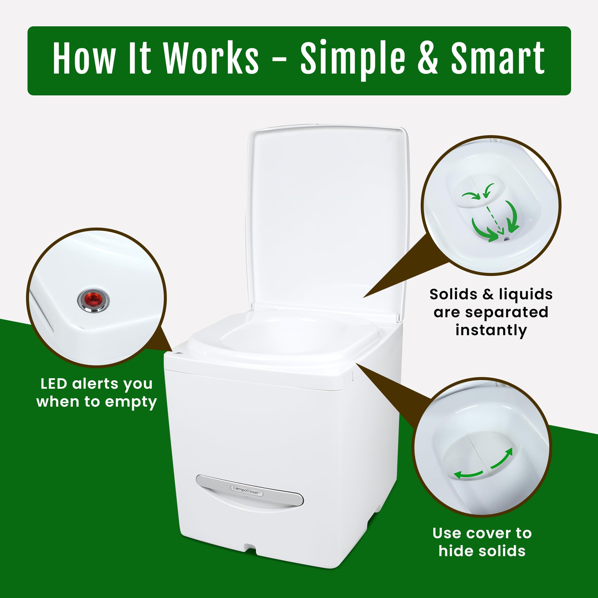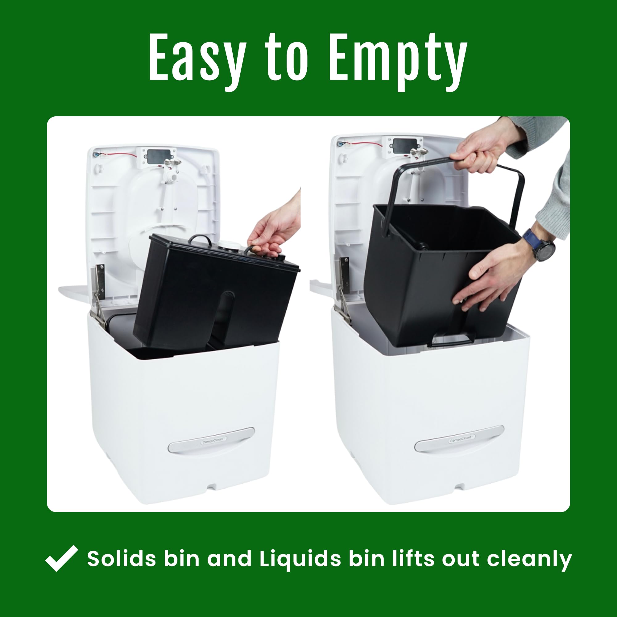 Easy-Clean Design with Smart Features - Removable solids bin with a bottom handle allows for hygienic, contact-free disposal every 2โ3 weeks. The front container features a no-spill valve for quick, clean emptying every few days, and the built-in LED light alerts you when it's time to empty. With a 3.9-gallon capacity, the main bin supports extended off-grid use with fewer trips to dispose of.