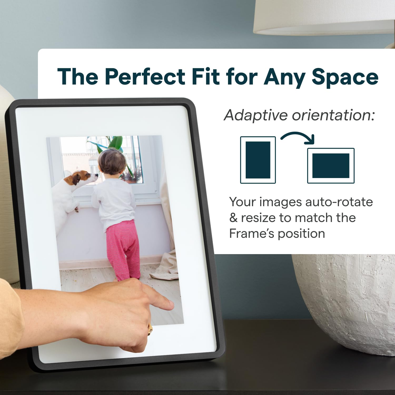 16GB STORAGE, FAST PERFORMANCE: Store thousands of photos and videos on this picture frame with 16GB of internal memory. The powerful 2GHz quad-core processor ensures fast uploads, smooth slideshows, and a responsive touch experience—no SD card required.