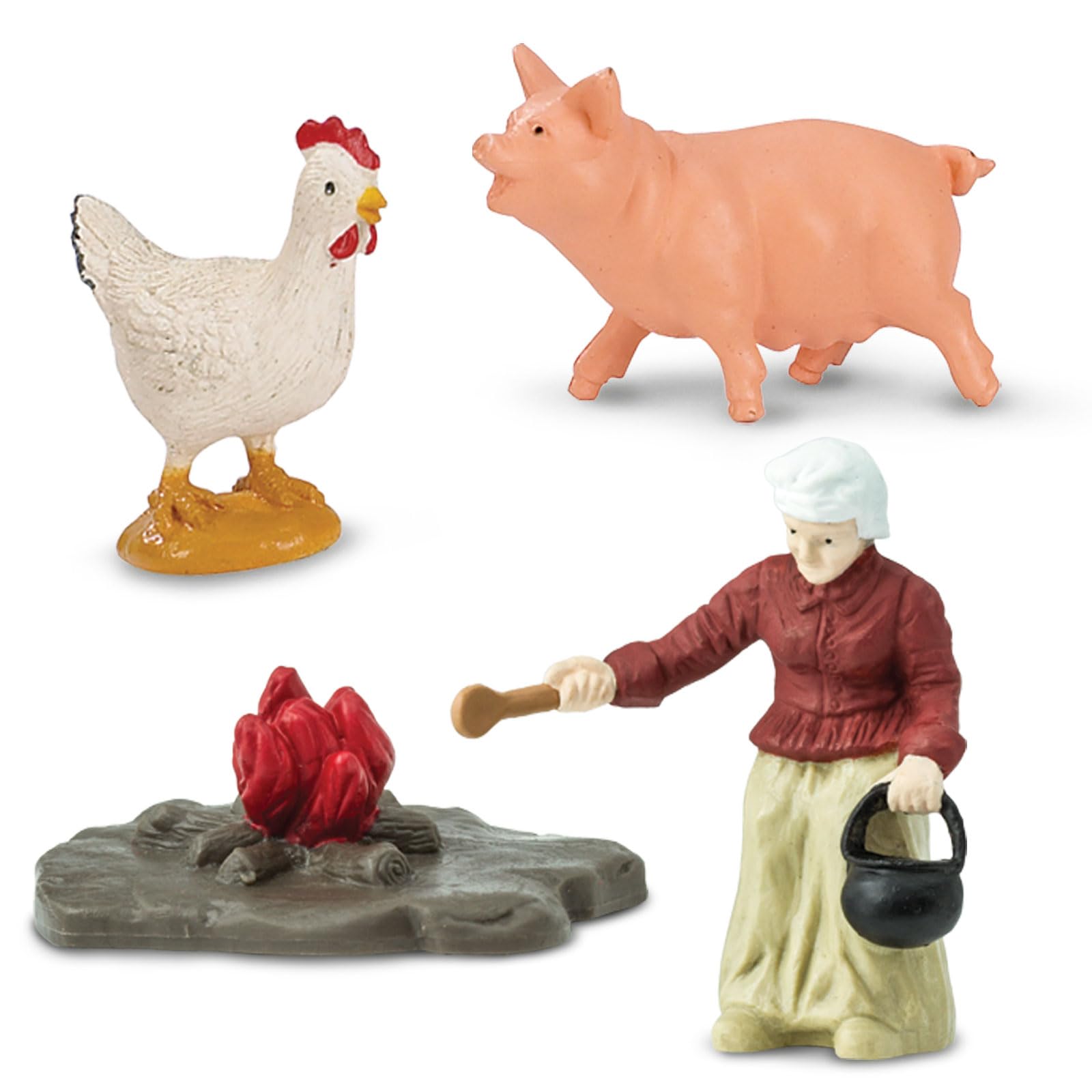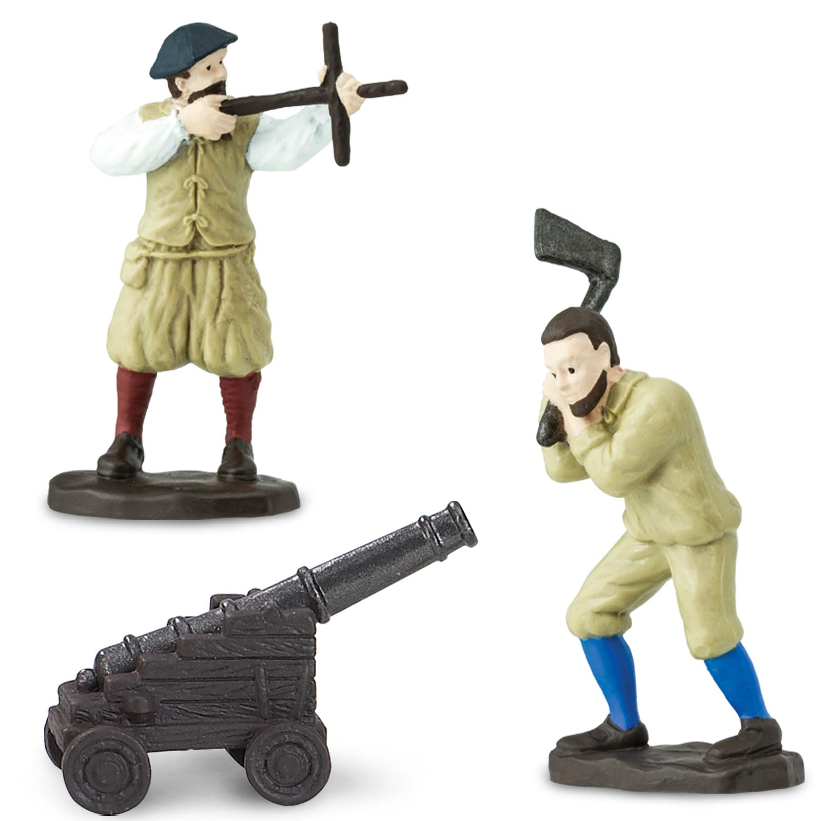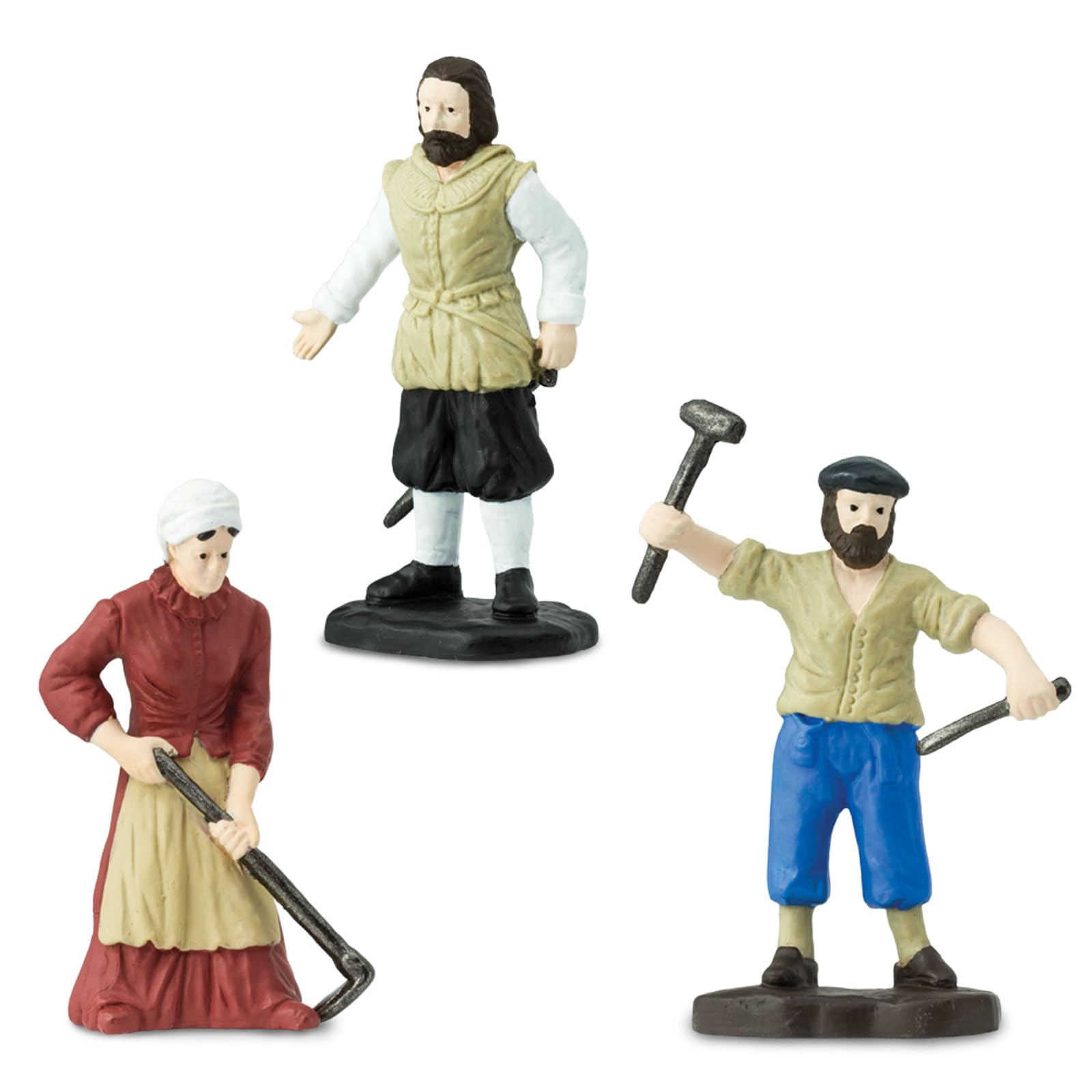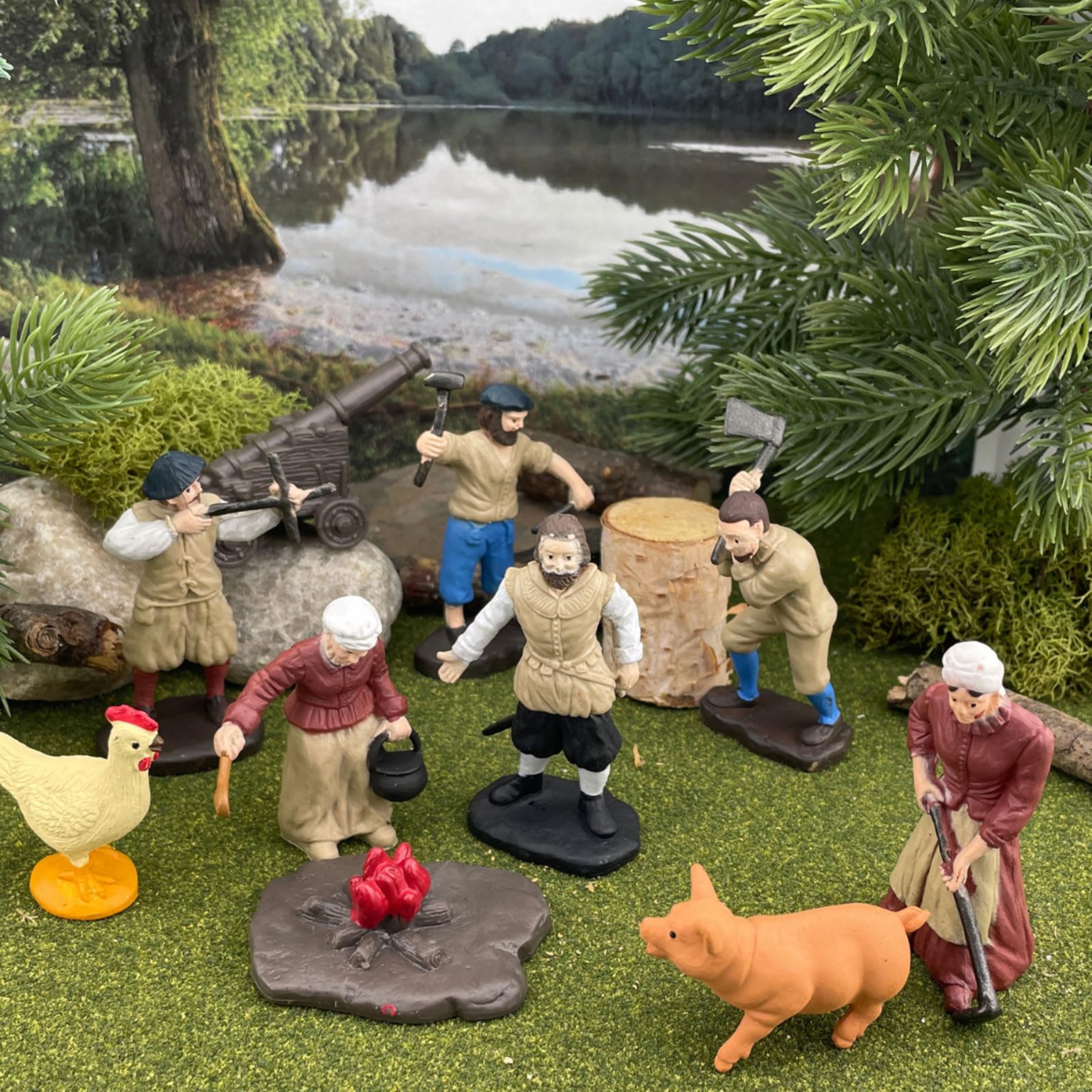 Historically Themed Collection: This Toob includes 10 miniatures capturing the essence of the Jamestown settlement: a sailor with a navigational device, a female gardener, a blacksmith, a settler workman, a female settler cooking, John Smith, a chicken, a pig, and a cannon.