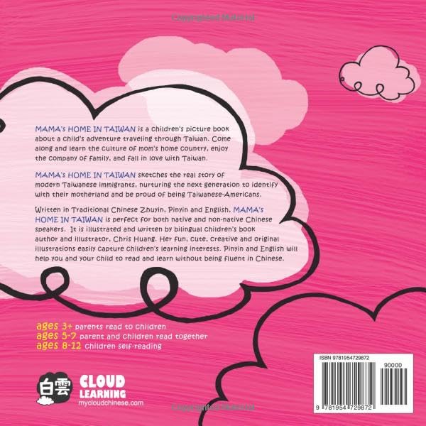 MAMA’s HOME IN TAIWAN is a children’s picture book about a child's adventure traveling through Taiwan. Come along and learn the culture of mom’s home country, enjoy the company of family, and fall in love with Taiwan. MAMA’s HOME IN TAIWAN sketches the real story of modern Taiwanese immigrants, nurturing the next generation to identify with their motherland and be proud of being Taiwanese-Americans. Written in Traditional Chinese Zhuyin, Pinyin and English, MAMA’s HOME IN TAIWAN is perfect for both native and non-native Chinese speakers. It is illustrated and written by bilingual children’s book author and illustrator, Chris Huang. Her fun, cute and creative and original illustrations easily capture children’s learning interests. Pinyin and English will help you and your child to read and learn without being fluent in Chinese. This book is suitable for parents to read to children ages 3 and up, for parent and children 3-5 years old to read together, and for self-reading children ages 6-12. 【媽媽的家在台灣】是海外繪作家黃老師Chris Huang, 寫給咱台灣移民下一代的兒童必讀繪本。經由孩子純真的敘述,介紹自己的媽媽來自台灣,自己是American Born Taiwanese, 透過在台灣的旅遊認識媽媽故鄉的文化,感受台灣家人溫暖的愛,最後以喜愛台灣為結語。 【媽媽的家在台灣】真切地勾寫出現代台灣移民的故事,我們不是建造鐵路的華工,我們的孩子不是ABC, 是ABT, 敎育海外下一代對母國的認同。 適合閲讀:年齡8-12自讀,5-7歲親子共讀,3-5歲親讀。