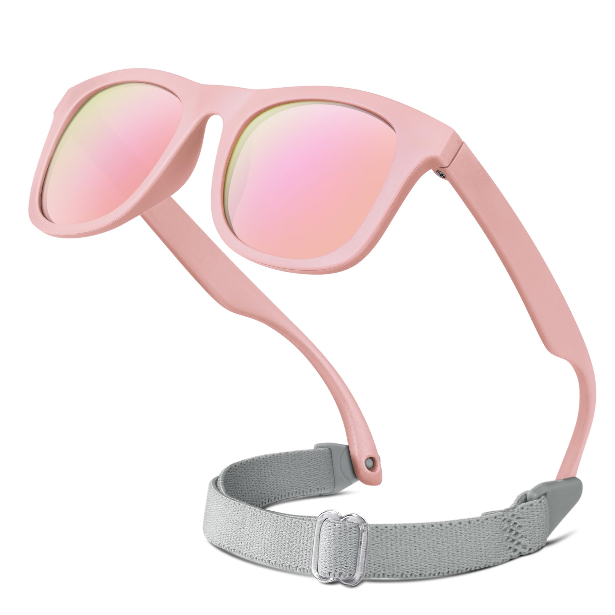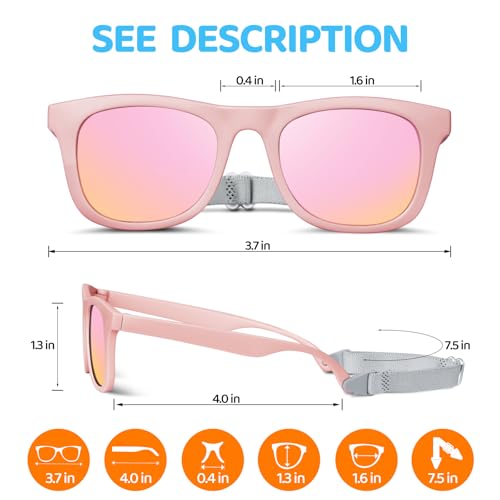 【Comfortable Fit for All Ages – Baby Essential】 These baby sunglasses feature a soft, adjustable strap and ultra-flexible frame to comfortably fit babies from 0-24 months. Lightweight, no slipping, no marks—perfect fit that grows with your child.