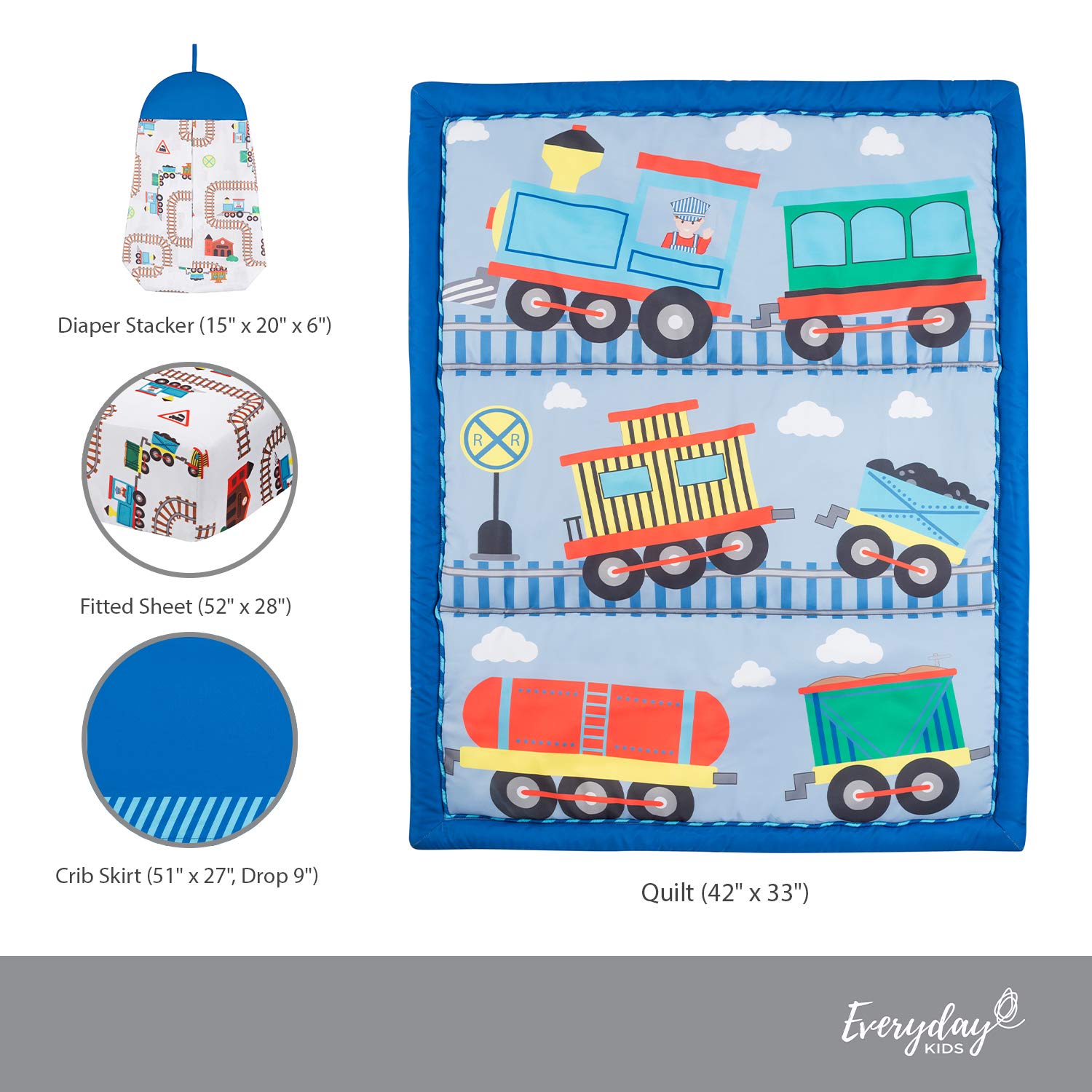 PERFECT FIT – This set includes a quilt (42 in. by 33 in.), a fitted sheet (52 in. by 28 in.) and a coordinating dust ruffle with a 9 in. drop (51 in. by 27 in.). The fitted sheet fits a standard sized crib mattress (approximately 52 in. by 28 in.) and has been tested for the perfect fit. (Crib mattress not included)