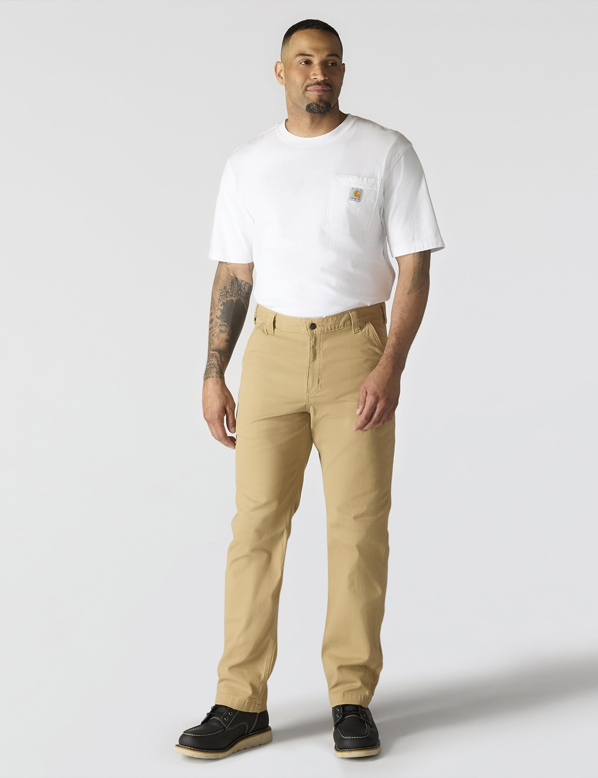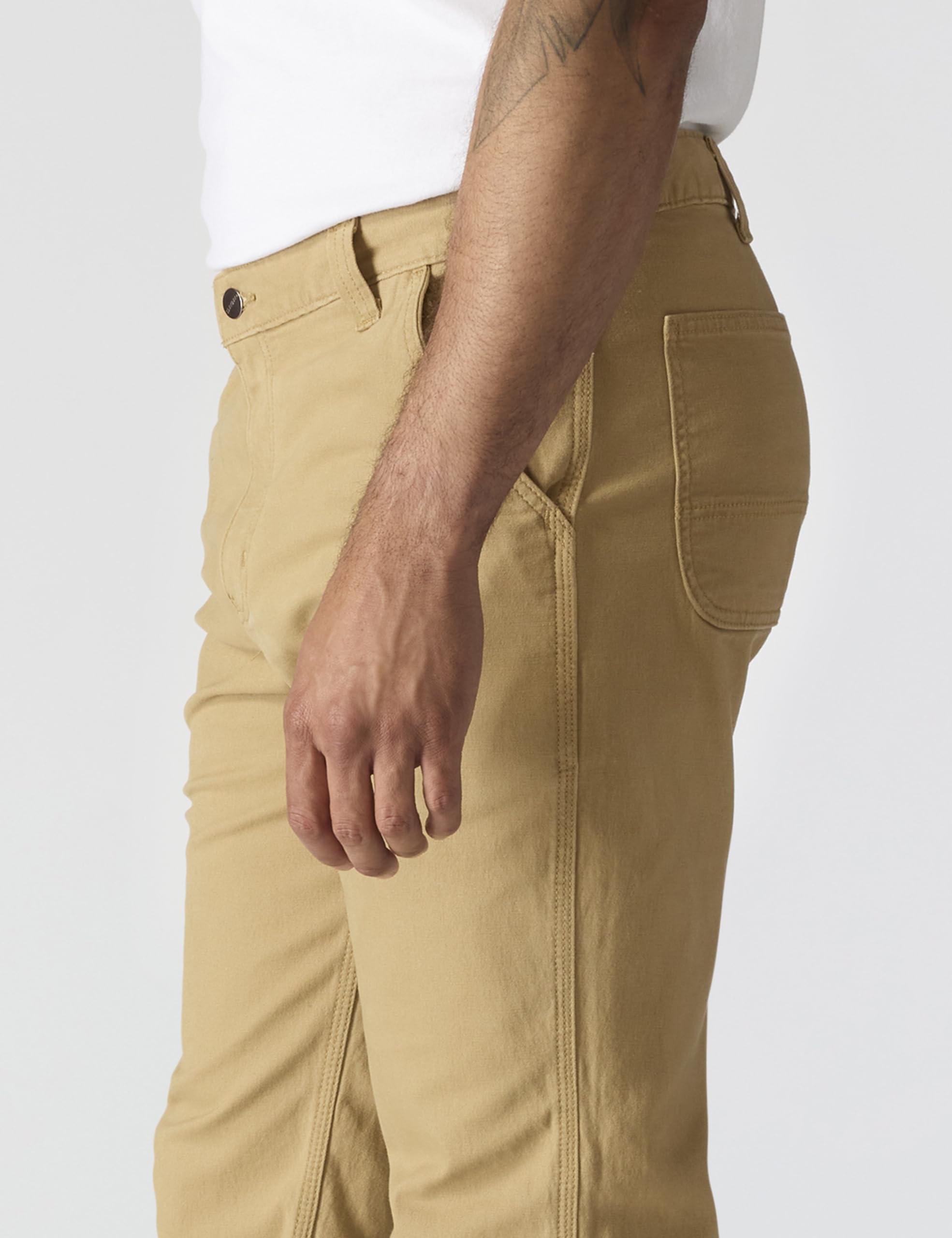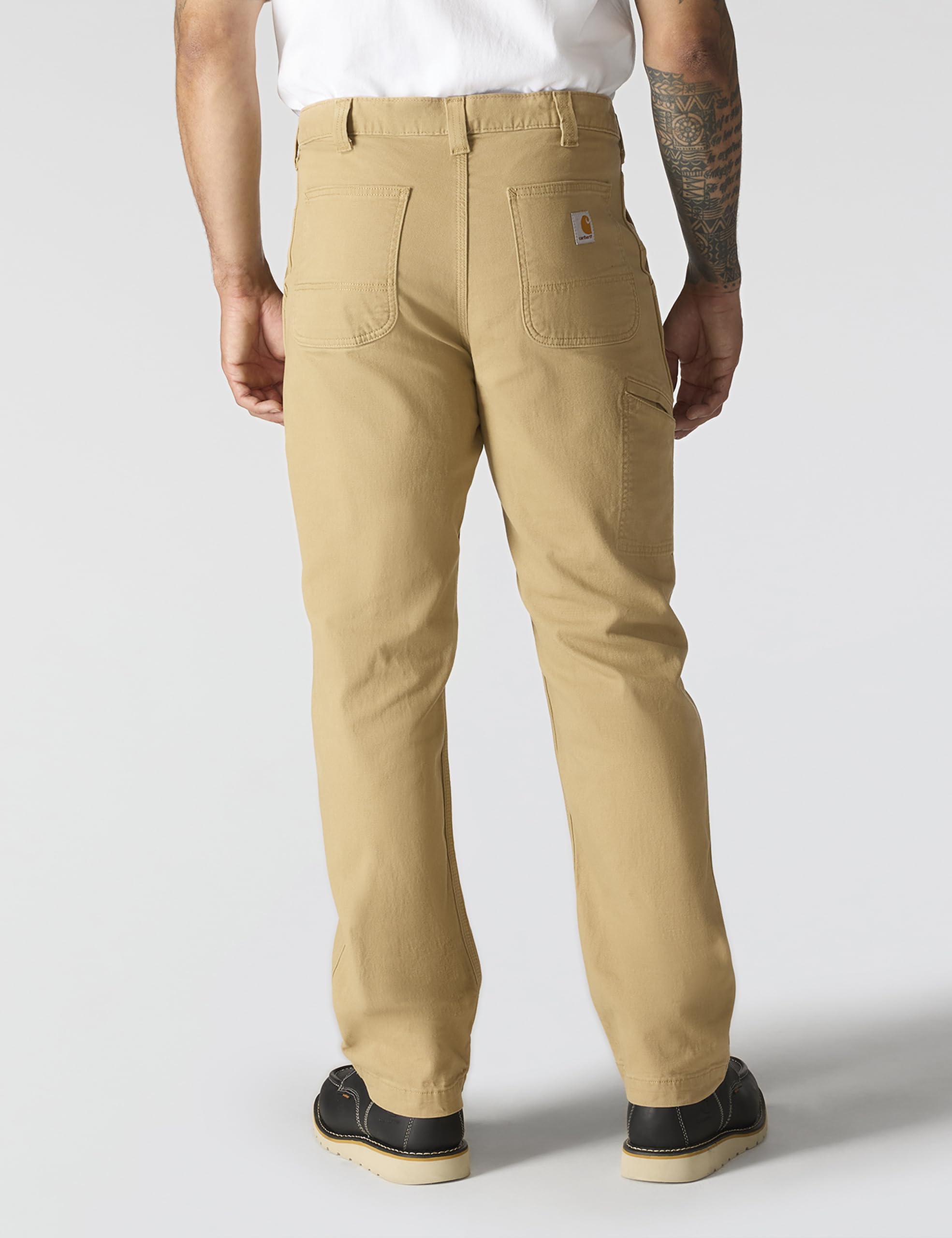 Description This dungaree features a hint of stretch for comfort and a cell phone pocket for functionality. It's made from 8-ounce, 98 percent cotton/2 percent spandex canvas and sits at the waist, has a relaxed seat and thigh, reinforced front slash pocket, belt loops sewn on the seam for strength, right-leg secured cell phone pocket and straight leg opening.