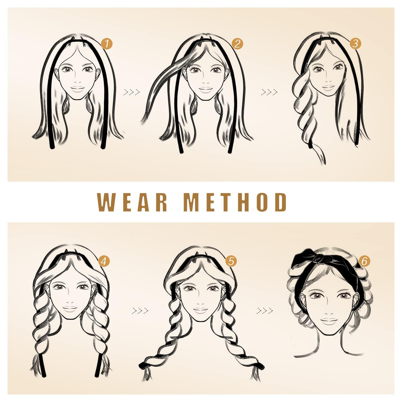 How to Use 1. Lightly wet dry hair with a spray bottle or wet brush. Or blow dry until slightly damp after showering. 2. Use bobby pins to fix the middle of the curling iron on the top of the head. 3. Start braiding hair from one side and wrap it around this curling iron. When the hair is braided to the end, secure it with a hair tie. 4. Cross the ends of the hairband behind the head and tie them into a knot in front of the clip on top of the head and remove the clip.