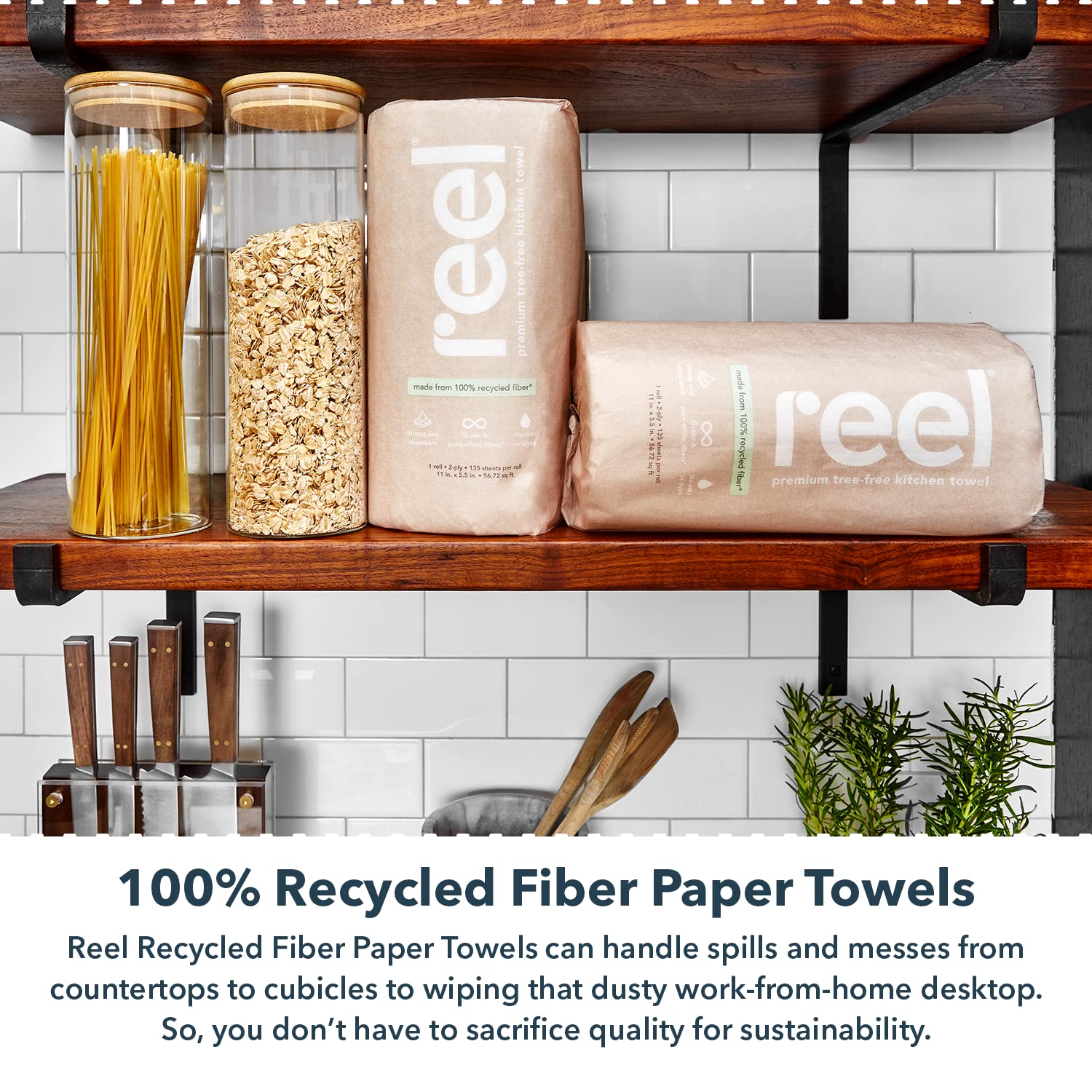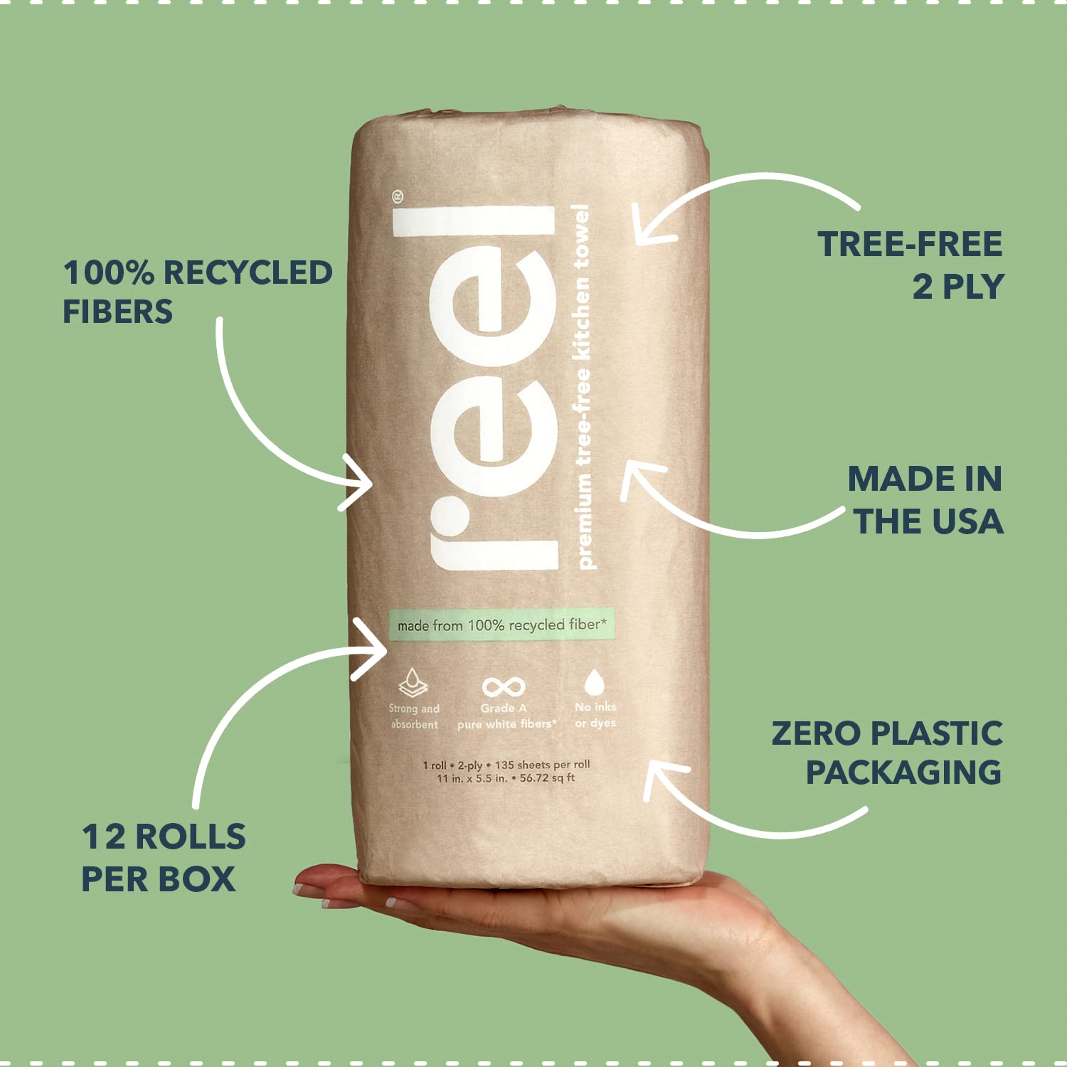 Premium 2-Ply Recycled Paper Towels: These Reel kitchen towels are made of 100% recycled paper fibers. Their absorbent, 2-ply sheets can handle messes, so you don’t have to sacrifice quality for sustainability. Includes 12 rolls per box.