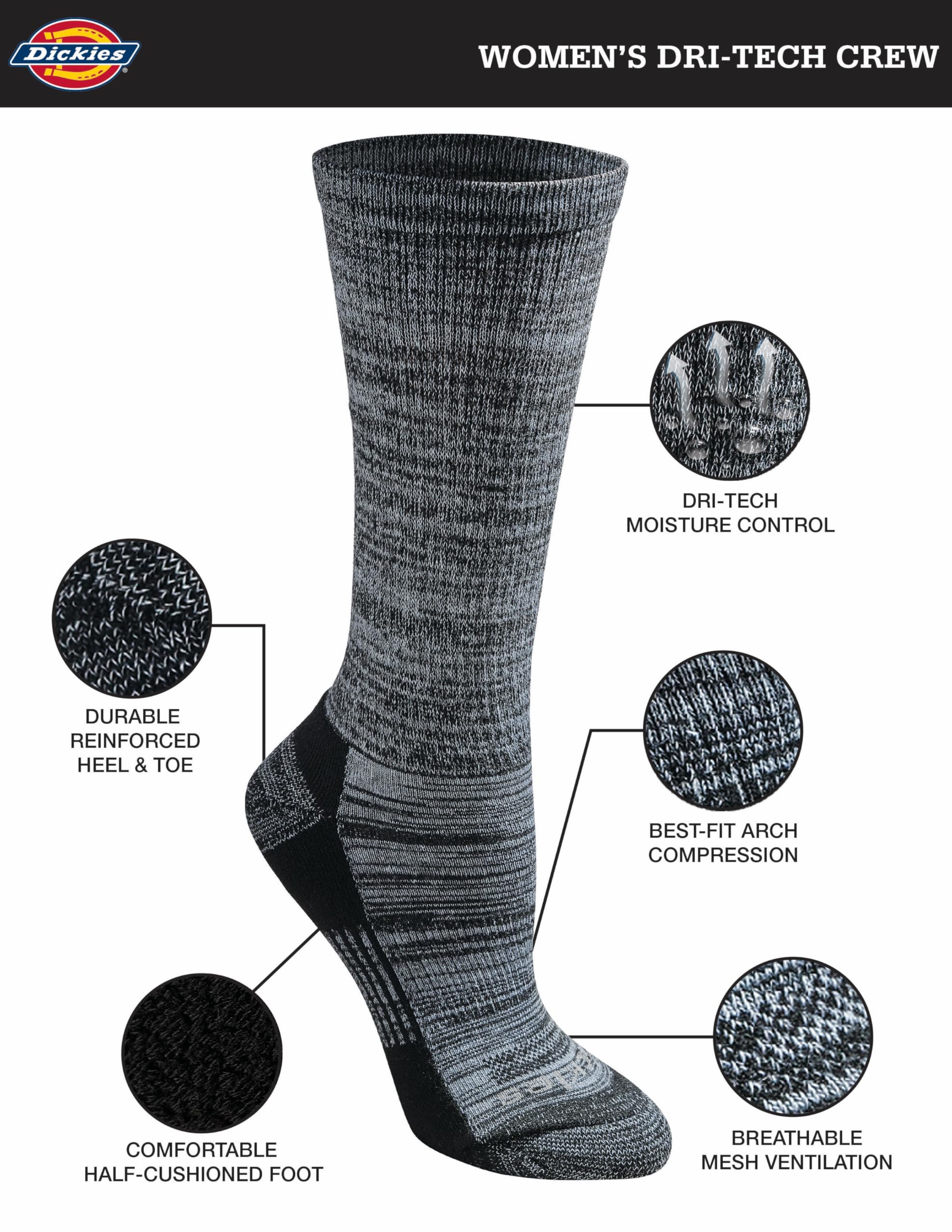 Description Dickies dri-tech moisture control for women's crew socks combines moisture wicking fibers and mesh ventilation channels to keep feet dry and comfortable. Since 1922 Dickies has been making hard-duty work products built to stand up to whatever life throws at you. Dickies Work Socks are built with purpose to deliver superior comfort and performance on and off the job. Dri-tech Moisture Control Sock Collection features: Moisture Management to help keep your feet cool, dry, and comfortable throughout the day.