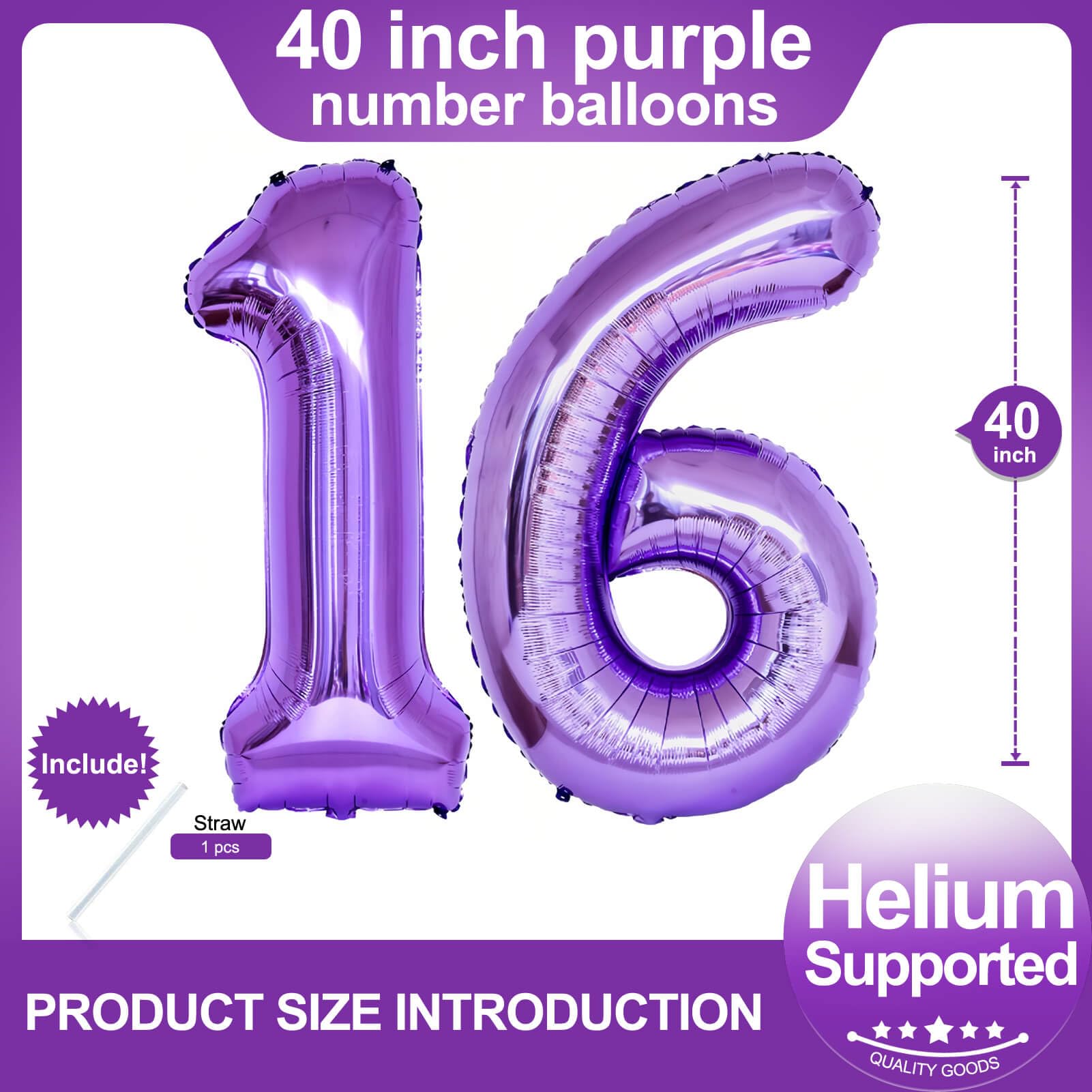 Color:Purple Packaged included:1 piece 40 inch Purple Number 1 and 6 balloon,1 straw to inflate. Purple 16 number foil balloons are the best for 16th birthday party, 16th wedding celebration, anniversary, ceremories celebration, business or big events party.Purple Sweet Birthday 16 Numbers balloons are perfect for birthday or anniversary party decorations. The jumbo design makes it wonderful backdrop in any occasions.Not only can create happy feelings for the party, but also allow you to take memorable pictures.You can DIY with other latex or foil balloons,makes your party more charming and impressive How to use:you can stick Purple 16 number balloons on the wall, window or door, you can inflate with both helium or air, you can even place them on the bed, floor or table, provide your party or home a good decoration.