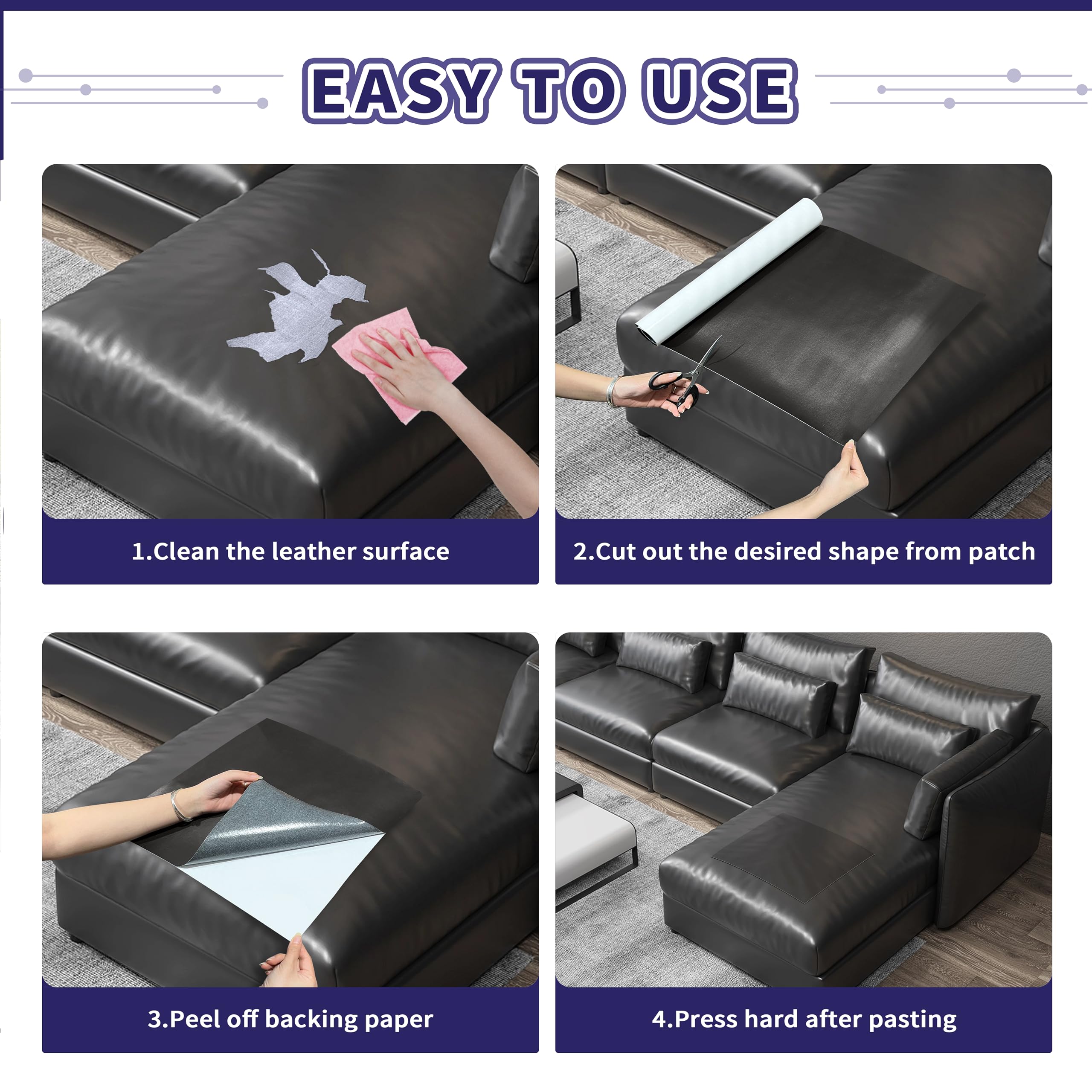 The sofa repair leather patch has strong self-adhesiveness and ease of use:clean up the damaged surface,cut out the appropriate size with scissors. Remove the backing paper on the adhesive and place it in the area that needs repair. It quickly makes your favorite furniture and clothes look new again. Under normal circumstances,this leather repair patch can last for several years,just like your new furniture.