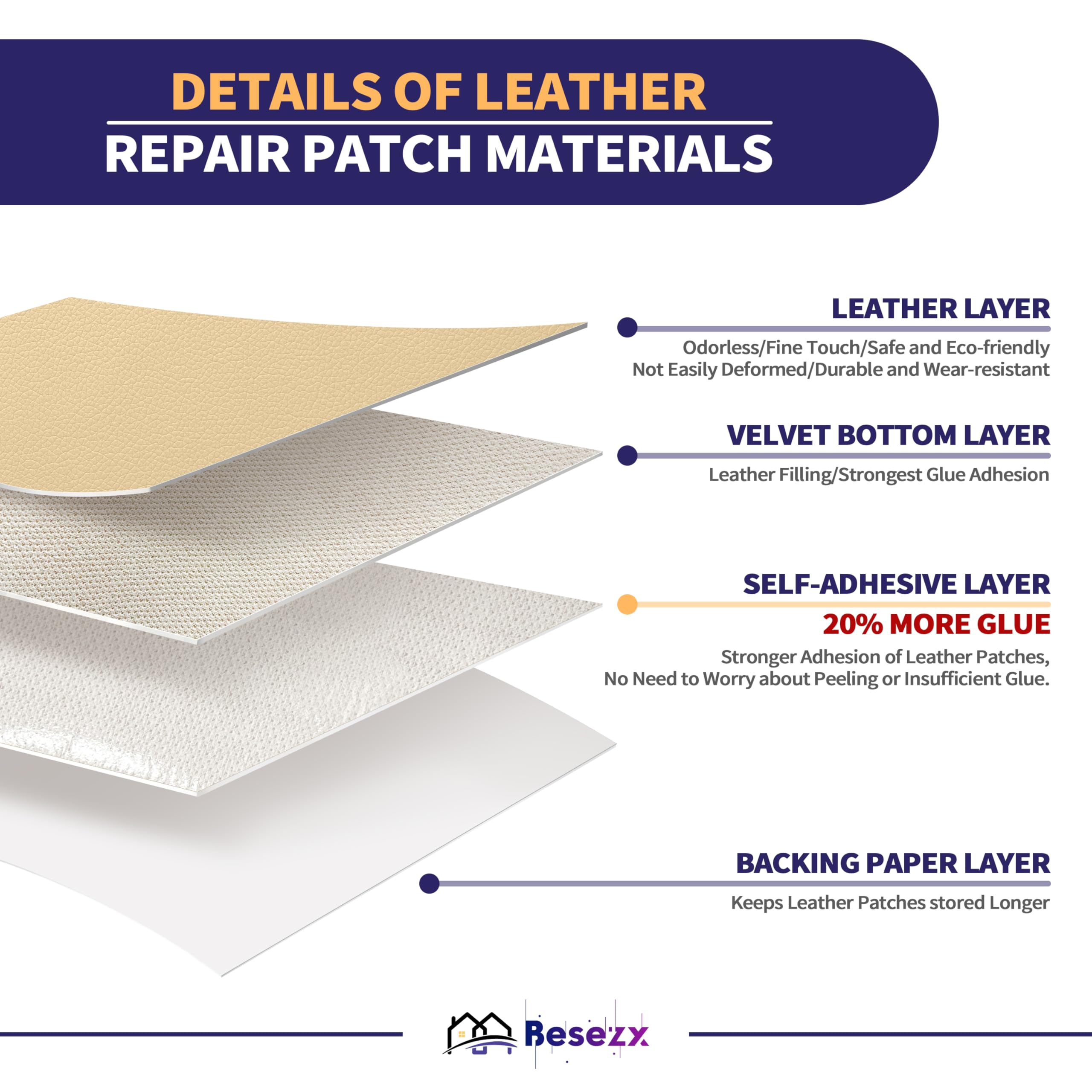 The size of the large leather repair tape is 30x16 inches,large enough to repair a large damaged area. You can cut any size and pattern as needed. Leather thickness: 0.8mm,moderate thickness,very suitable for patching. The super-strong adhesive makes the leather patch firmly adhere to the repair surface.