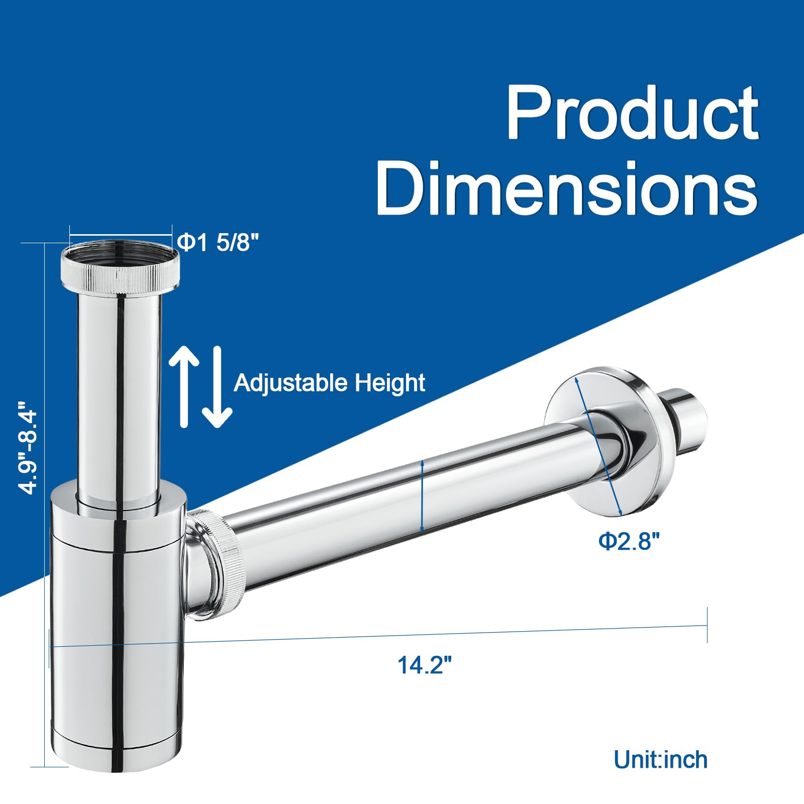 Specification Name Basin Bottle P-Trap/ Waste Pipe with Pop-up Drain Material P-Trap Made of Brass,Stainless Steel Pipe, Chrome Finished Modern design Works on your wall mounted sink, offers a decorative alternative to the traditional P-trap fittings in the exposed area under the lavatory, creates a good look in your restroom Bottle P-Trap Size Adjustable height 4.9 - 8.4 inch, Length (Fully Assembled): 14.2 inch, Fits 1.25" Diameter Inlet Pipe(standard 1 1/4" connections to basin waste) Flange Diameter: 2.3 inch Removable Trap for easy clean The bottle P-Trap meets plumbing code requirements in USA. Smooth interior will not easy to accumulate particulates debris and soap scum, cause buildup or bad odors.