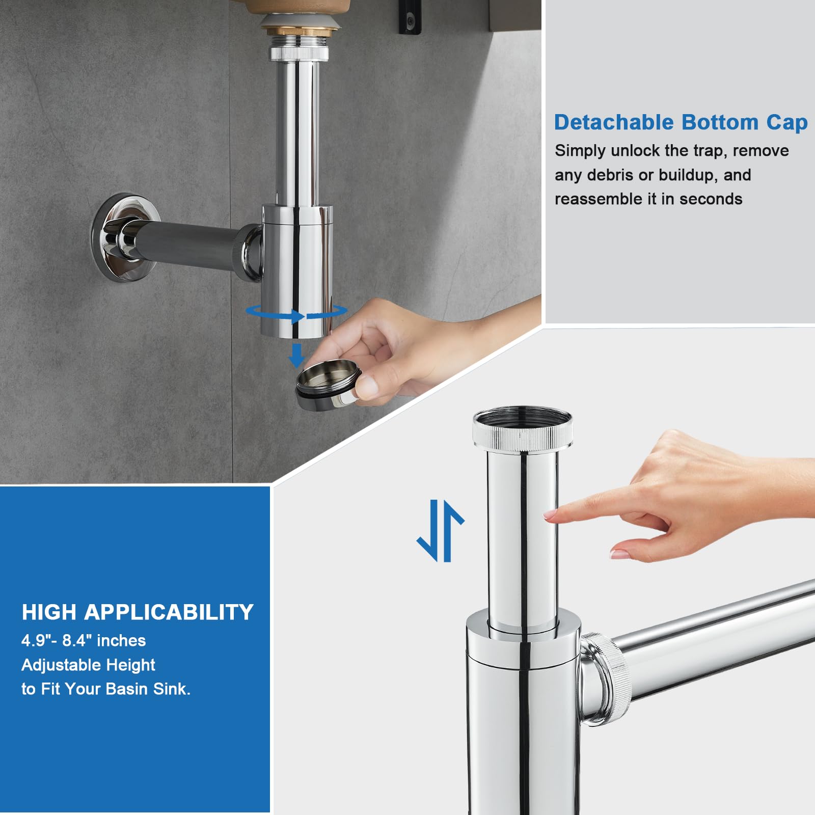 【Adjustable Design】The P-Trap adjustable height include 4.9 - 8.4 inch, allowing for easy installation and flexibility in fitting different basin sink sizes.