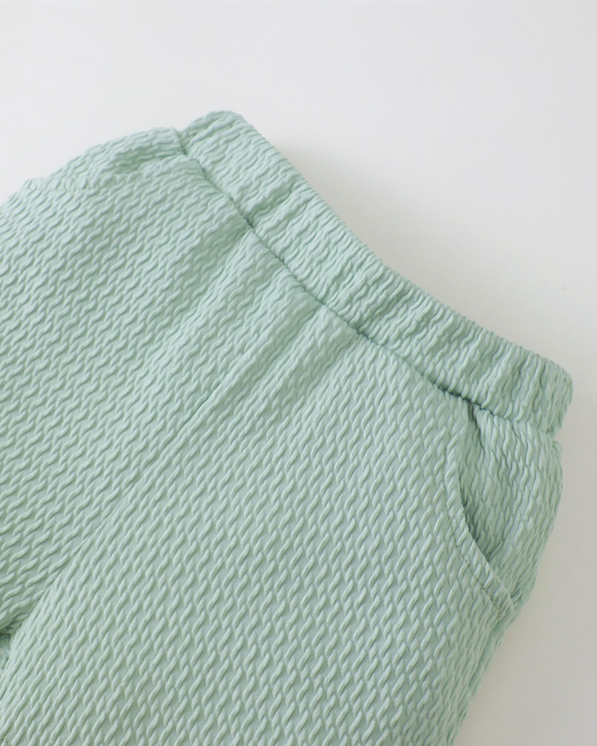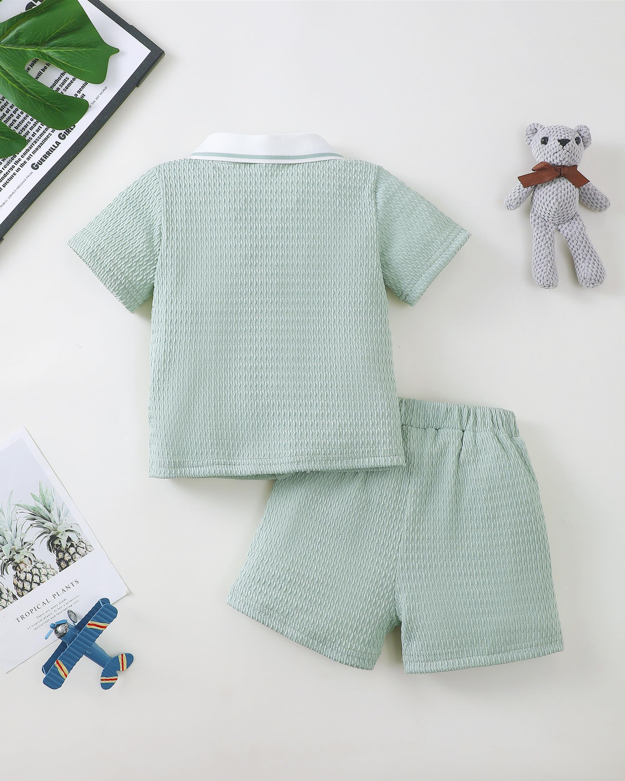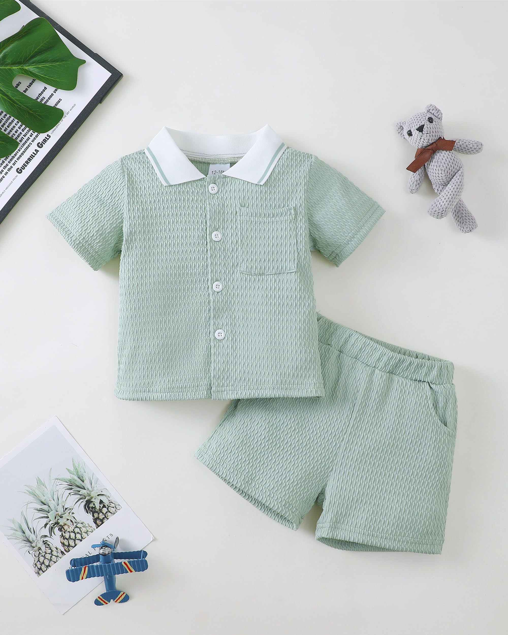 Minimalist Solid Design: Features a clean solid light green color with a white collar contrast and front pocket, offering a fresh, timeless summer style for little boys.
