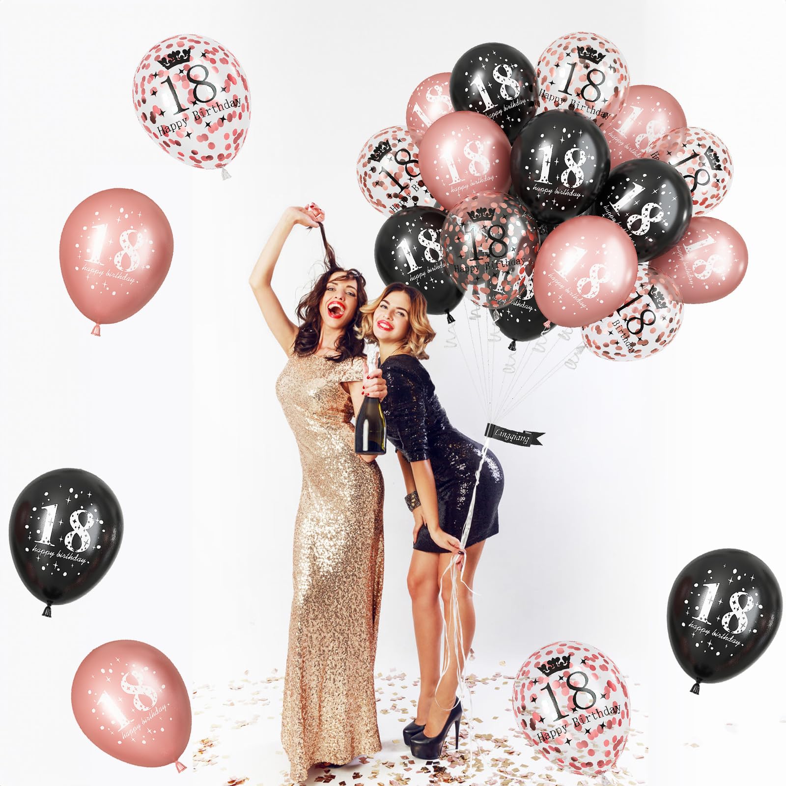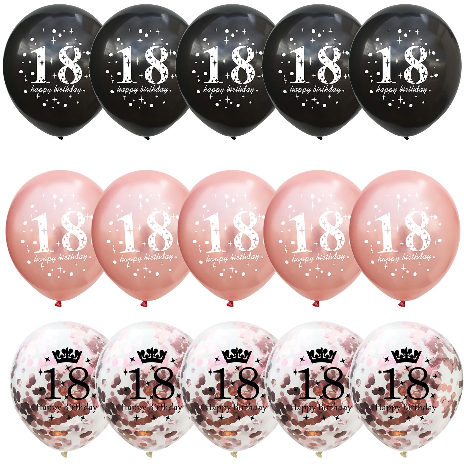🎂 18th Birthday Balloons - You will get total 15 pieces 12 inch rose gold black happy 18th birthday latex balloons, inclulde 5 pcs rose gold print balloons, 5 pcs black print balloons, 5 pcs rose gold confetti print balloons, come with a balloon ribbon. Perfect for her girls 18th birthday party decorations supplies.