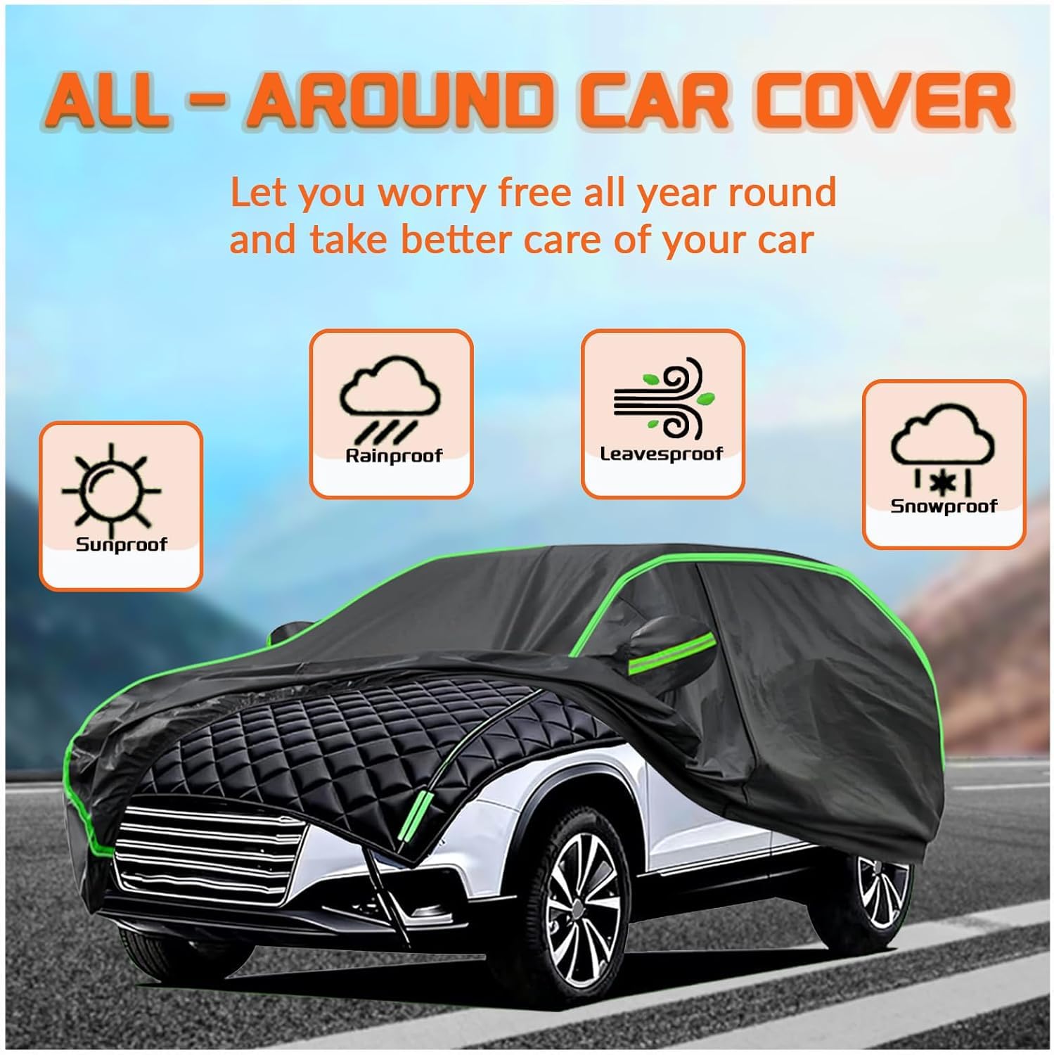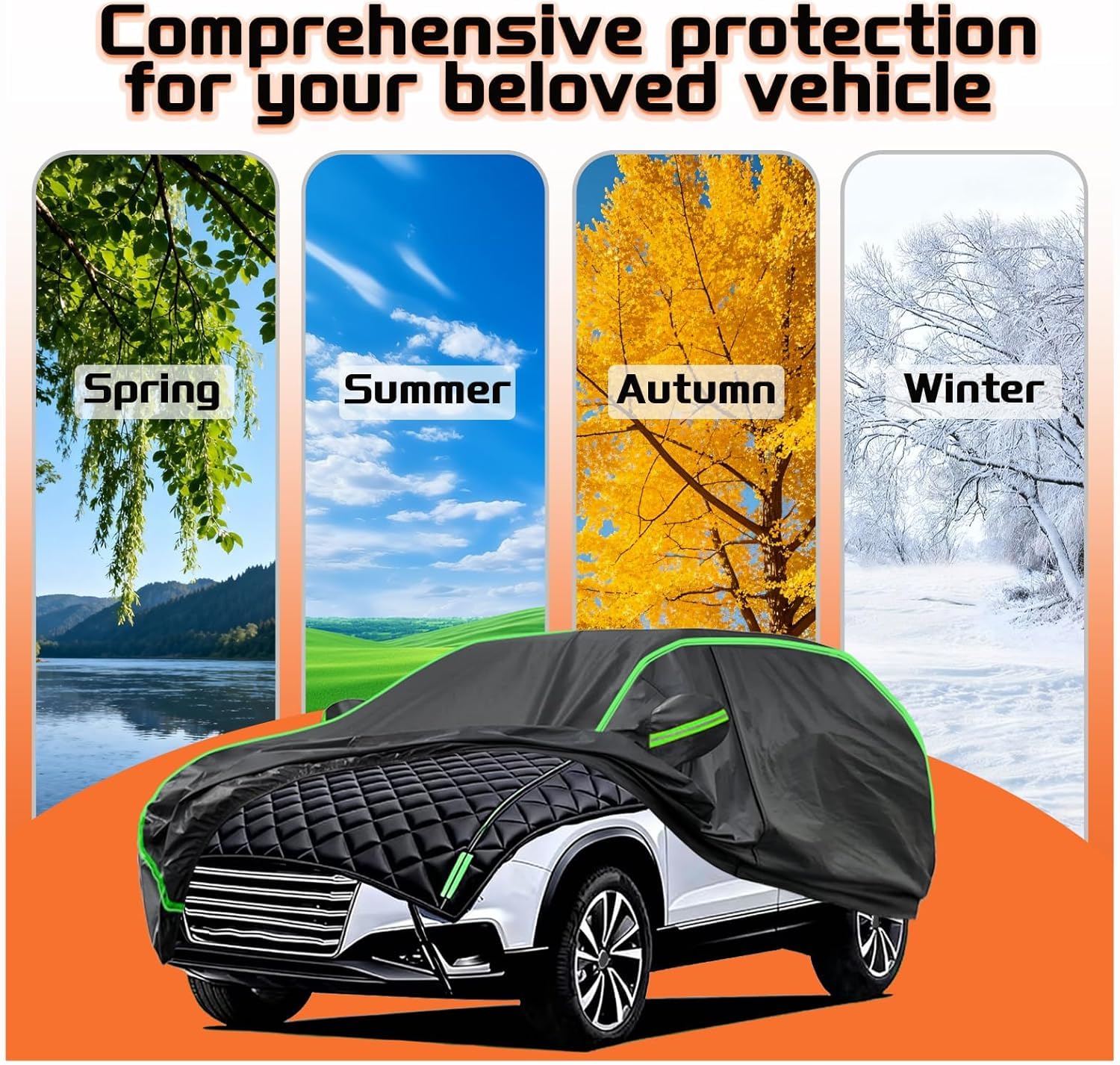 【All-Season, All-Weather Protection】Built for reliable year-round performance, this full car cover shields your vehicle from rain, snow, intense sunlight, dust. Suitable for both indoor and outdoor use, it also adds extra protection against unexpected hail.