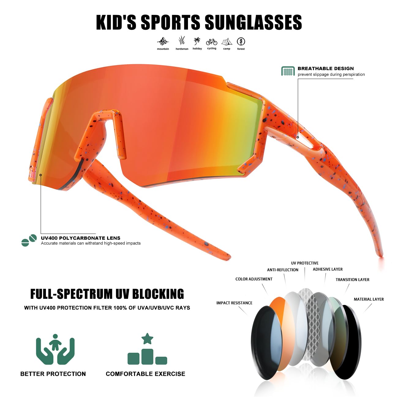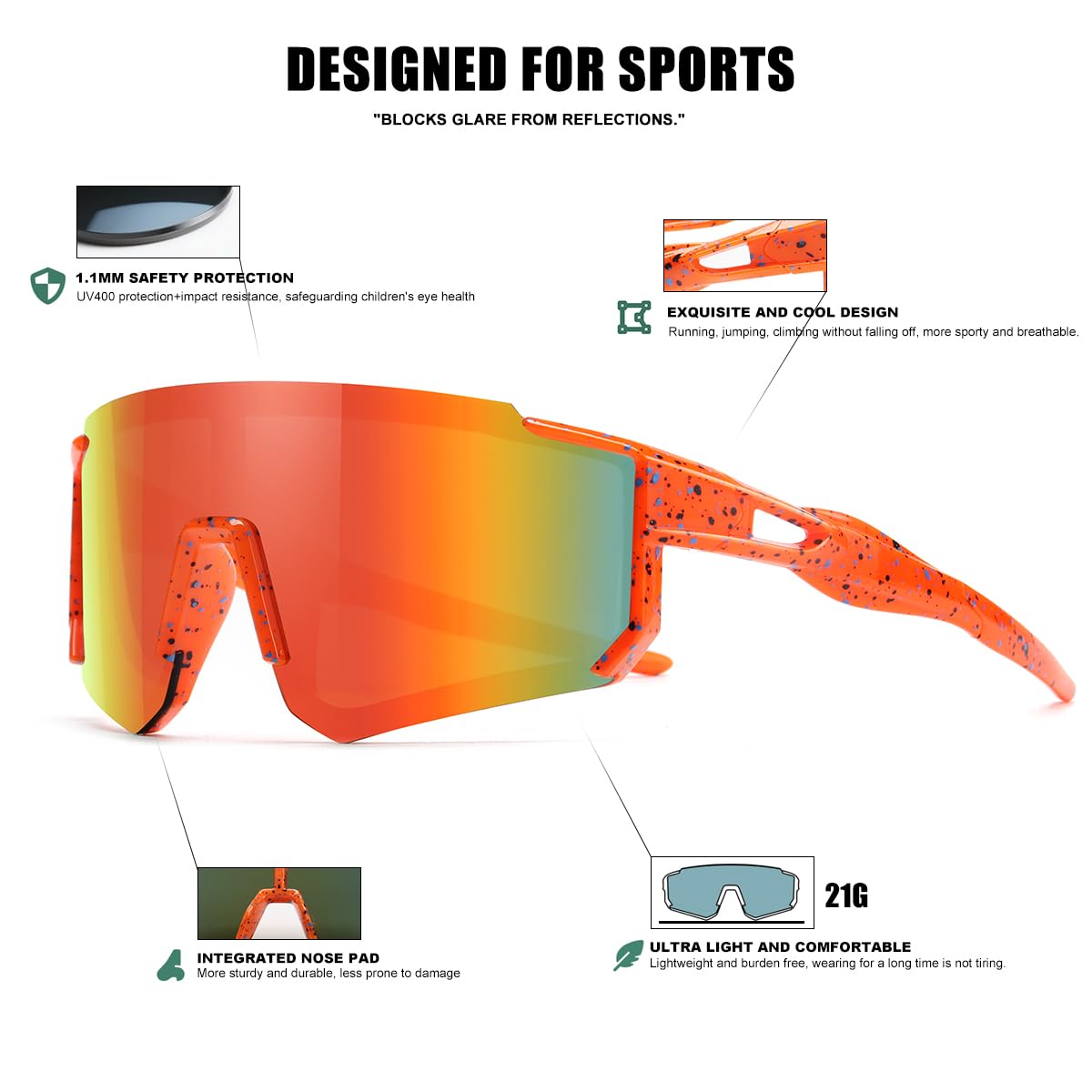 KIDS SPORTS SUNGLASSES - These youth sunglasses weigh only 26 grams, making them the ideal choice for outdoor sports such as baseball, cycling, fishing, softball, golf, hiking, running, and more.