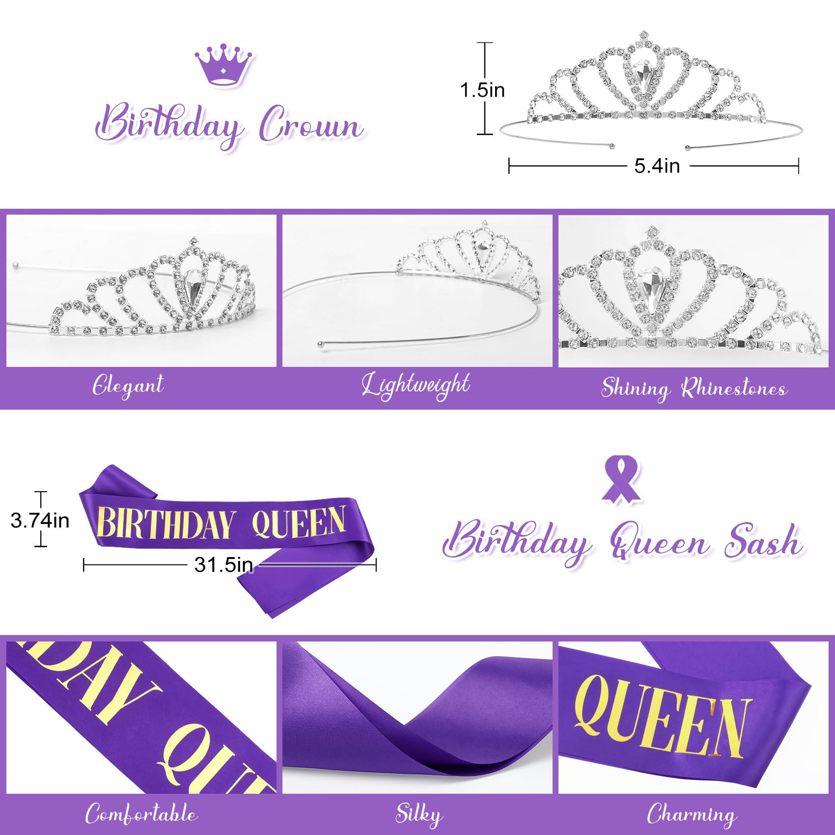 Beautiful Birthday Sash and Tiara: Set the stage with an elegant table cloth that serves as the focal point of your party decor; Adorn the host of honor with a graceful birthday queen sash and crown for photos in this lavender birthday decorations, symbolizing her special status and adding touch to the festivities