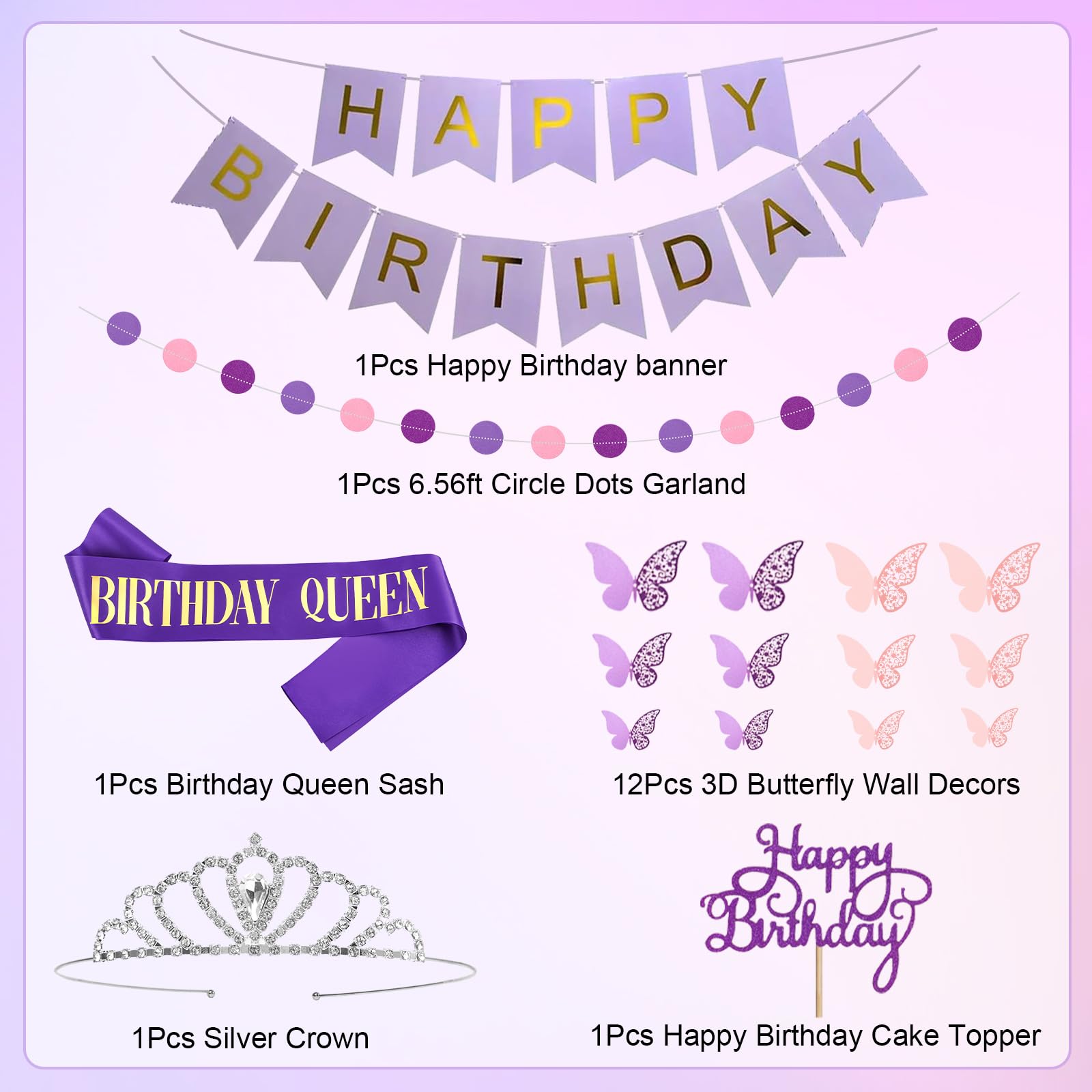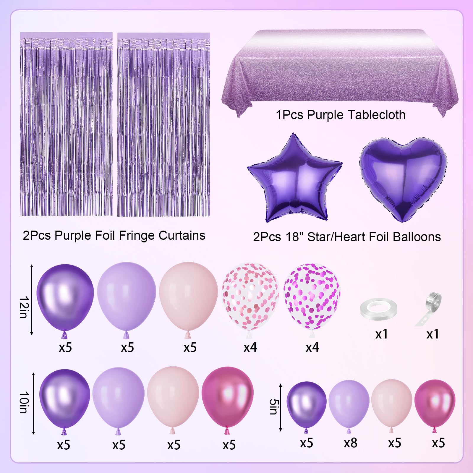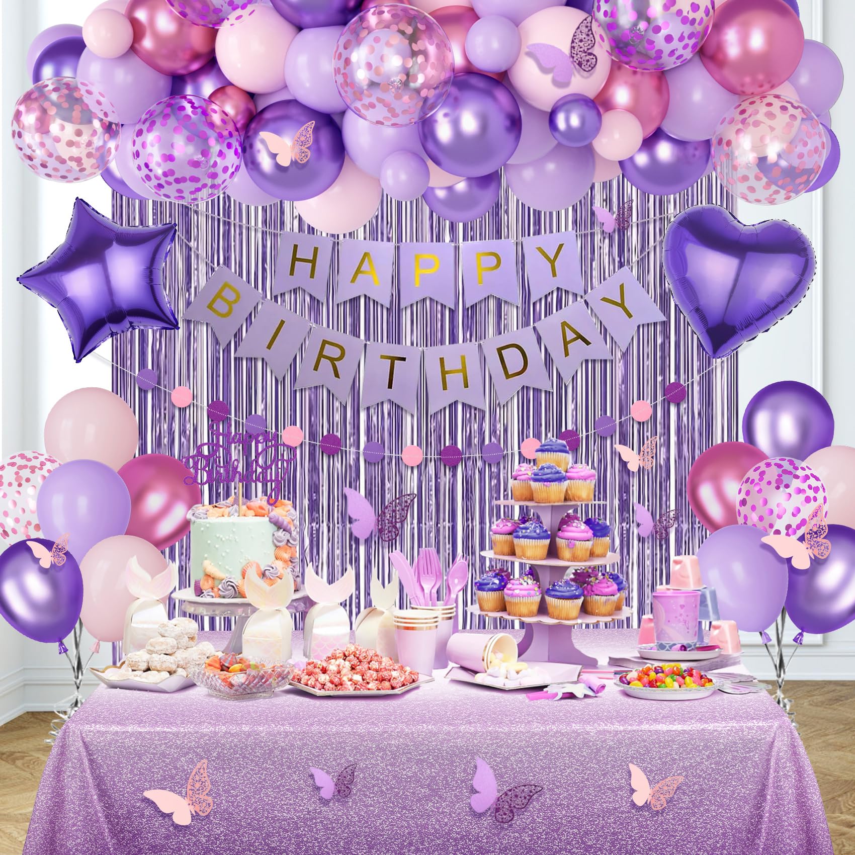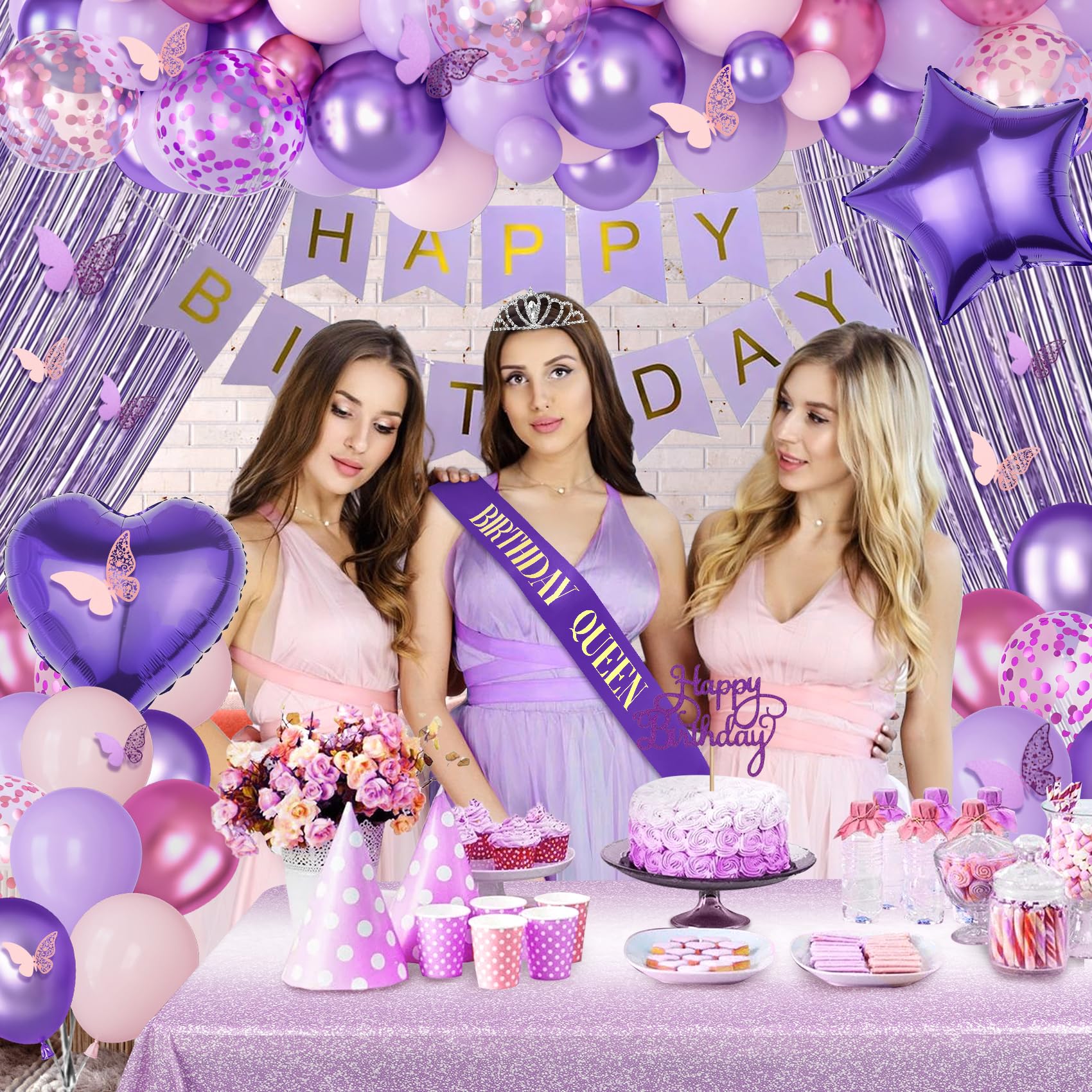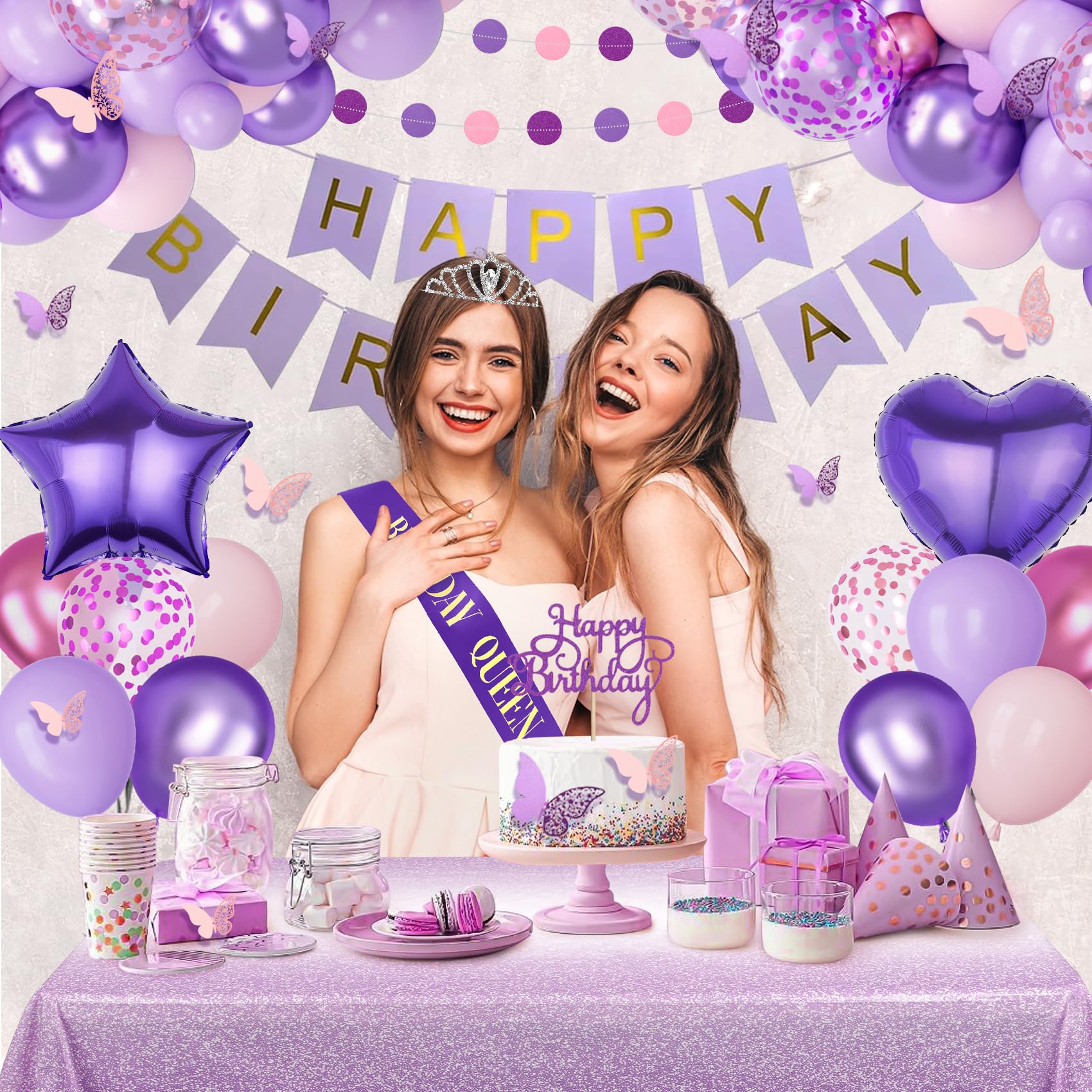 Pink and Purple Birthday Decorations: Our purple party decorations kit includes 1 pcs table cloth, 1 pcs birthday crown, 1 pcs birthday queen sash, 2 pcs foil fringe curtains, 1 pcs happy birthday banner, 1 pcs circle dots garland, 1 pcs cake topper, 12pcs butterfly wall decor, 2 pcs 18" purple heart and star foil balloons, 66 pcs 12" 10" 5" pink or purple confetti/metallic purple/metallic pink/pastel pink and purple balloons and 2 pcs balloon tools