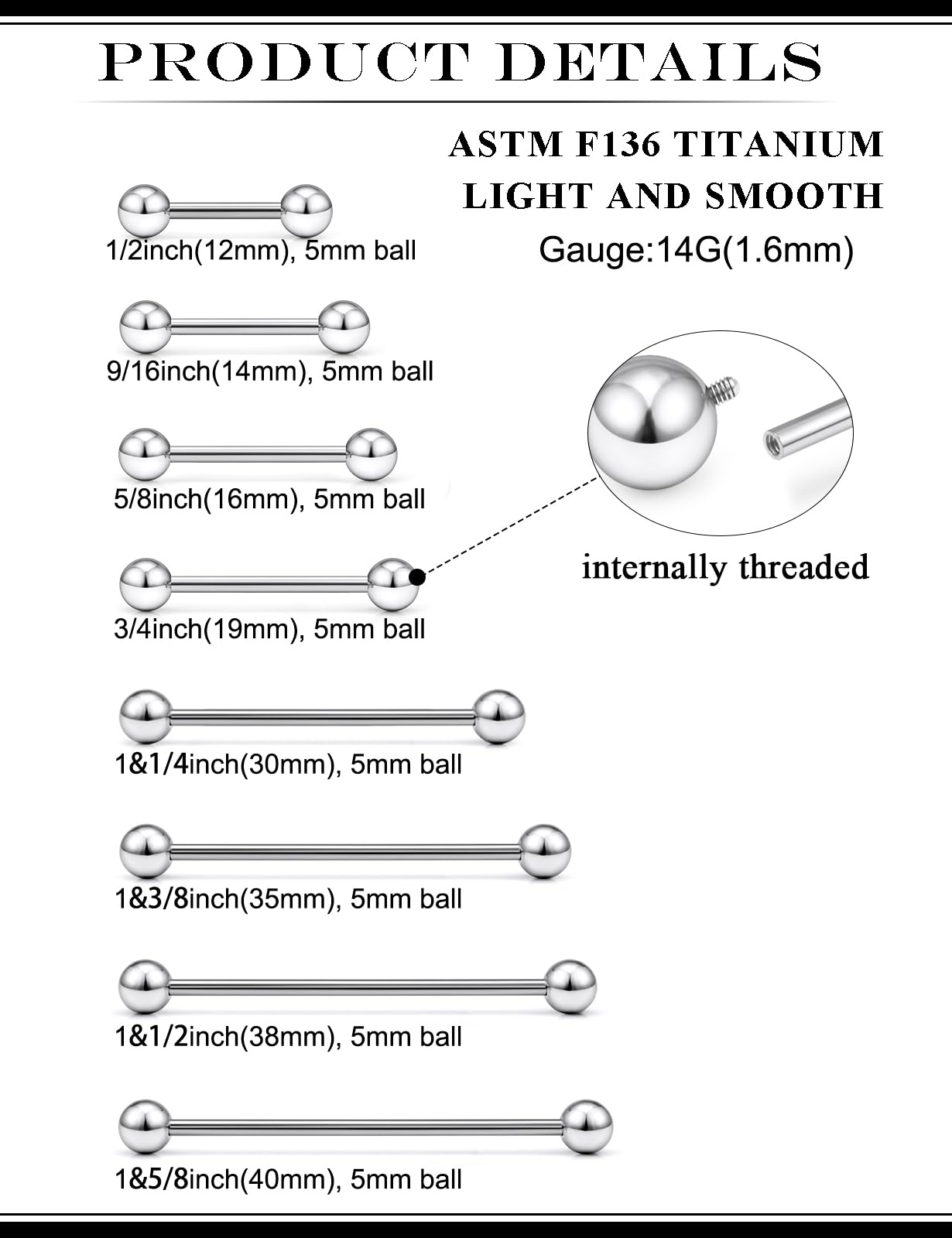 【Suitable for】: These titanium straight barbell piercing jewelry can be used as industrial barbell, industrial piercing, industrial jewelry, industrial piercing jewelry, industrial earrings