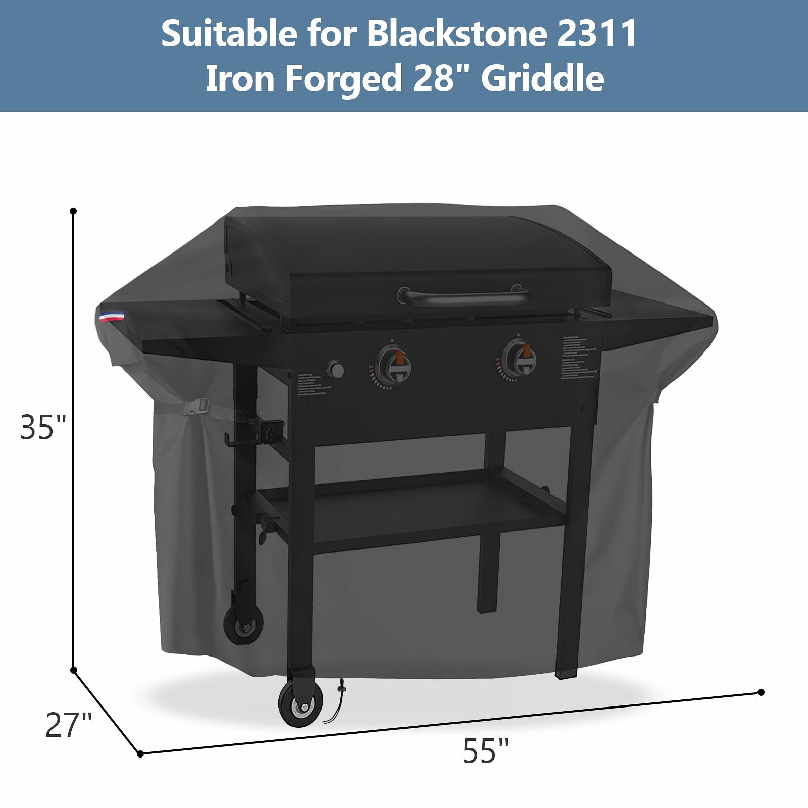 Dimension: 55"Lx27"Wx35"H, designed for Blackstone 28" griddle, fits model 1819 1883 1924 2086 2094 2147 2199 2287 2311 2325 2355 . Also fits for other griddle grill with similar size