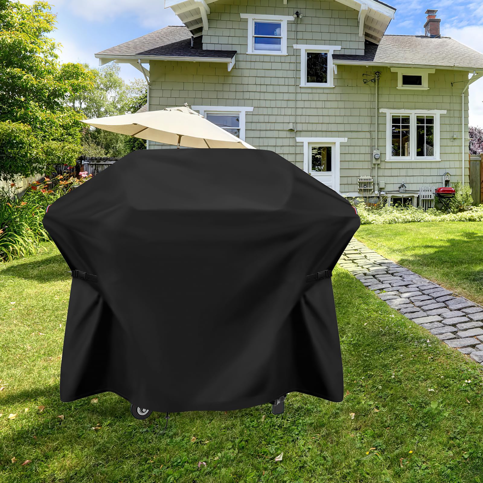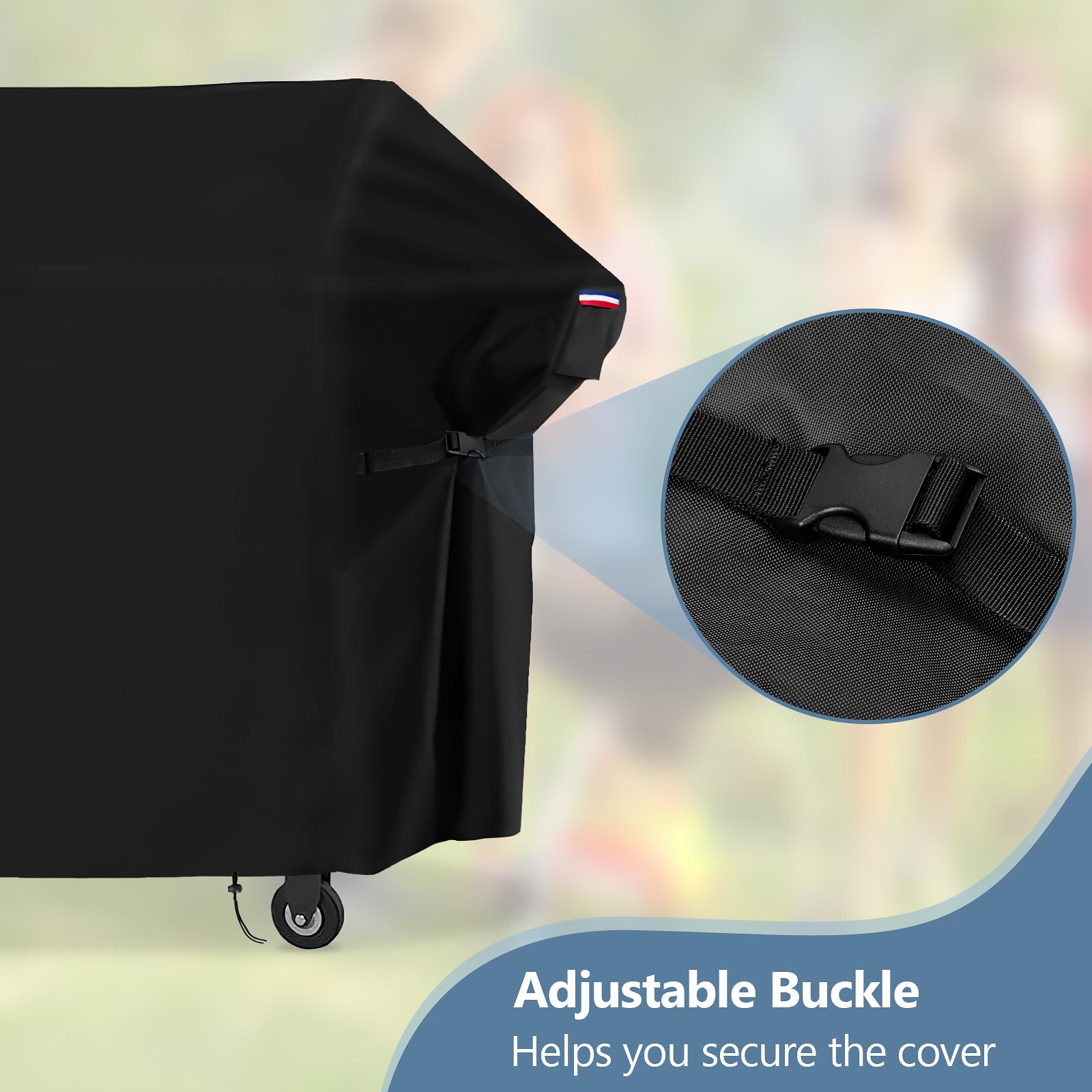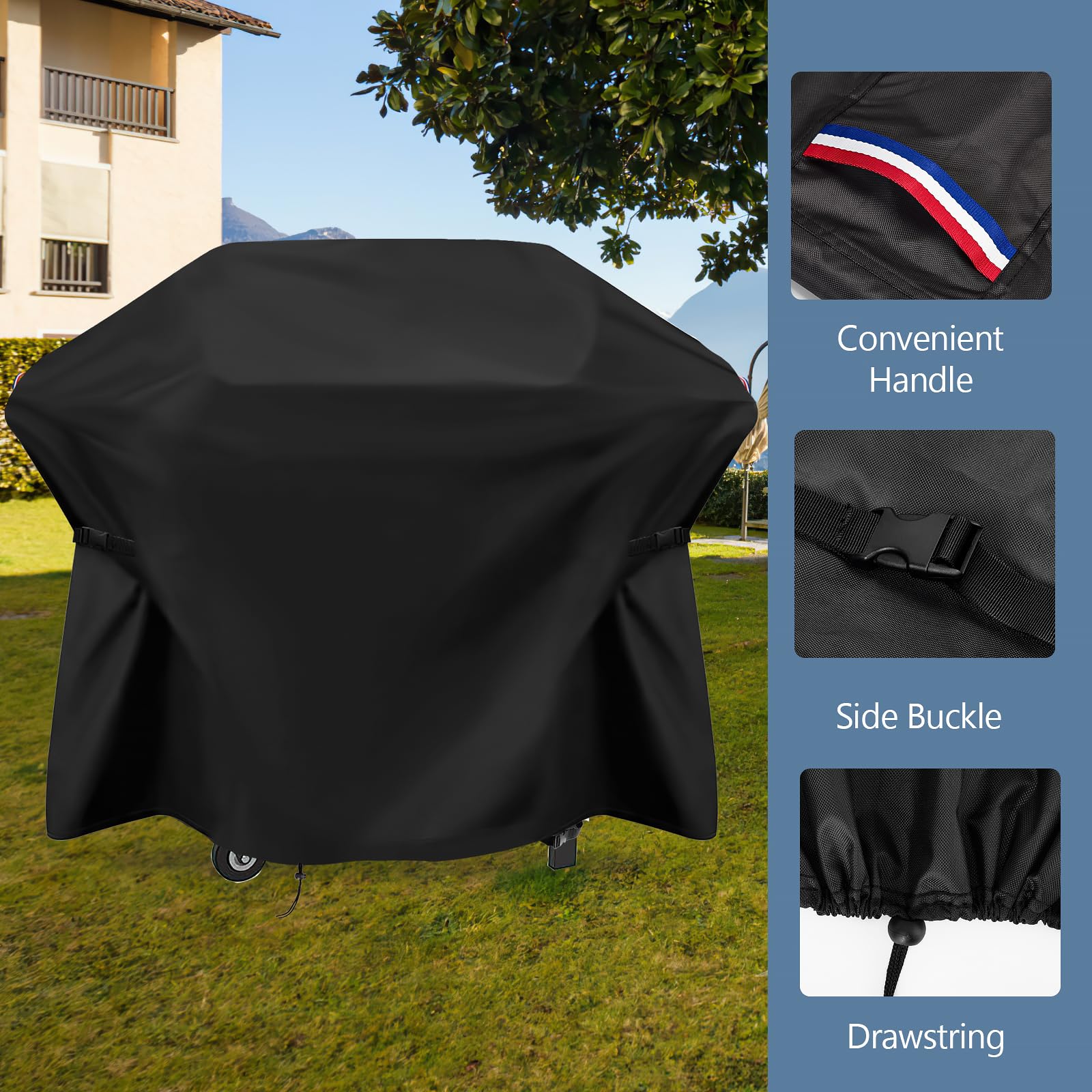 Drawstrings & Buckle & Handle: Elastic cord allows the cover to fit better with the Blackstone grill. Adjustable buckle on the grill egs for better extra stability, so you don't have to worry about the impact of windy weather. The handle is convenient for your daily use