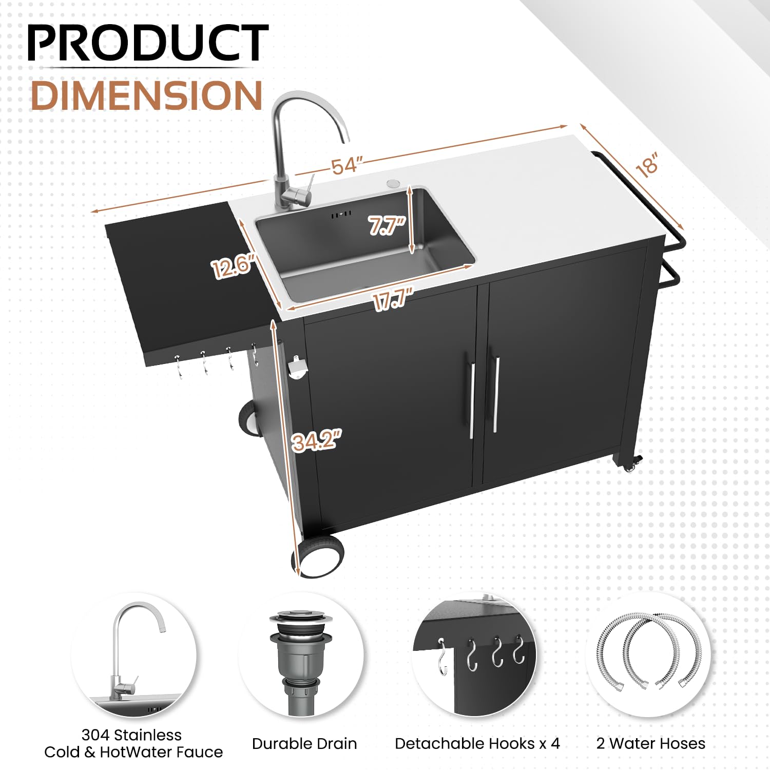 【Smart Multi-Functional Workspace】Expand your outdoor kitchen capabilities with a 38"-54" adjustable workstation featuring prep surfaces and dedicated zones for grilling tools The integrated 7.7'' deep basin sink with debris filter pairs with 60+ gallon enclosed storage, 4 utensil hooks, trash bag holder, integrated bottle opener and paper towel rack for complete BBQ organization.