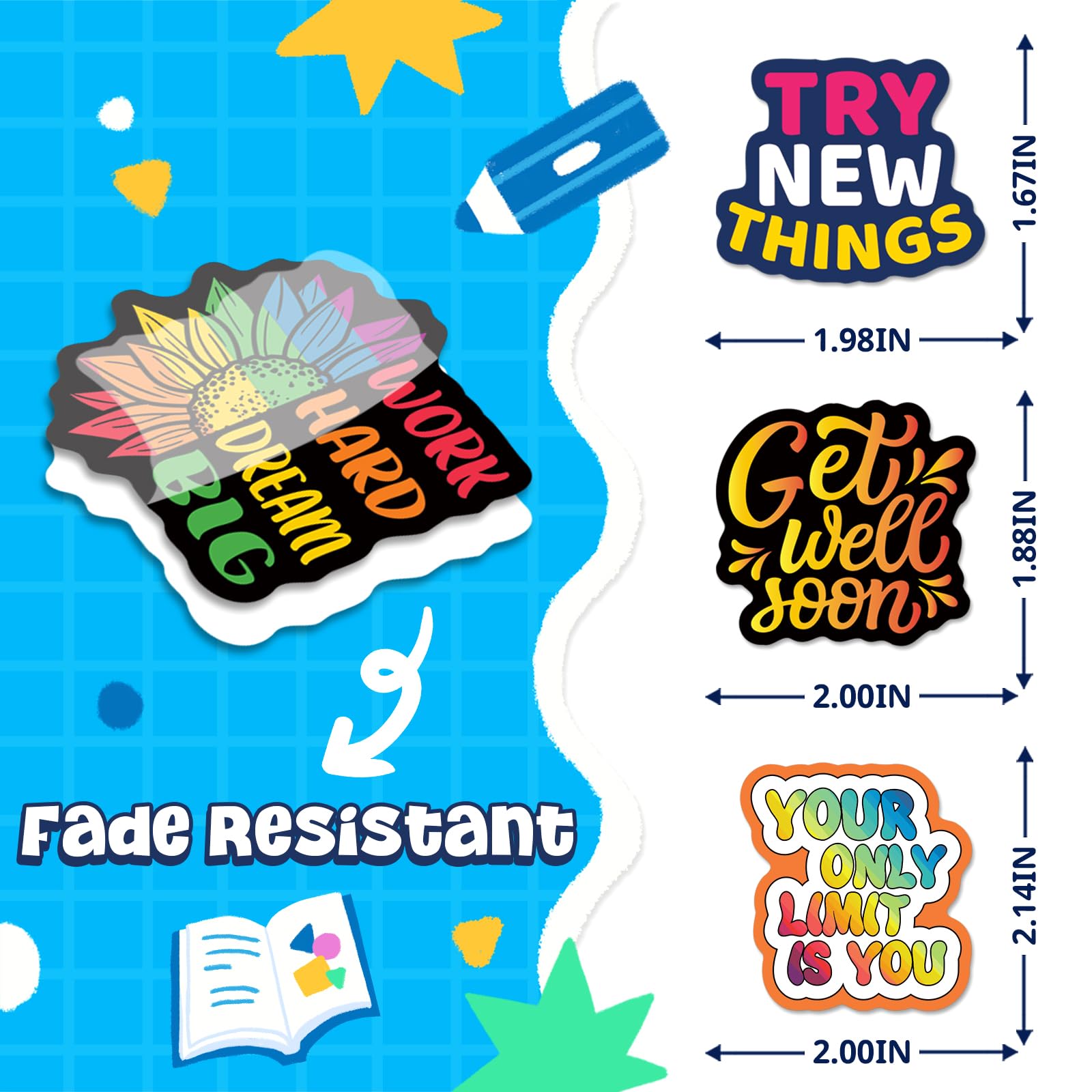 Glossy Vinyl Stickers: Made of high-quality vinyl, these waterproof inspirational stickers are durable, reusable, and easy to apply to any smooth surface without leaving sticky residue. Their great durability makes them stay vibrant and intact, even with daily use.