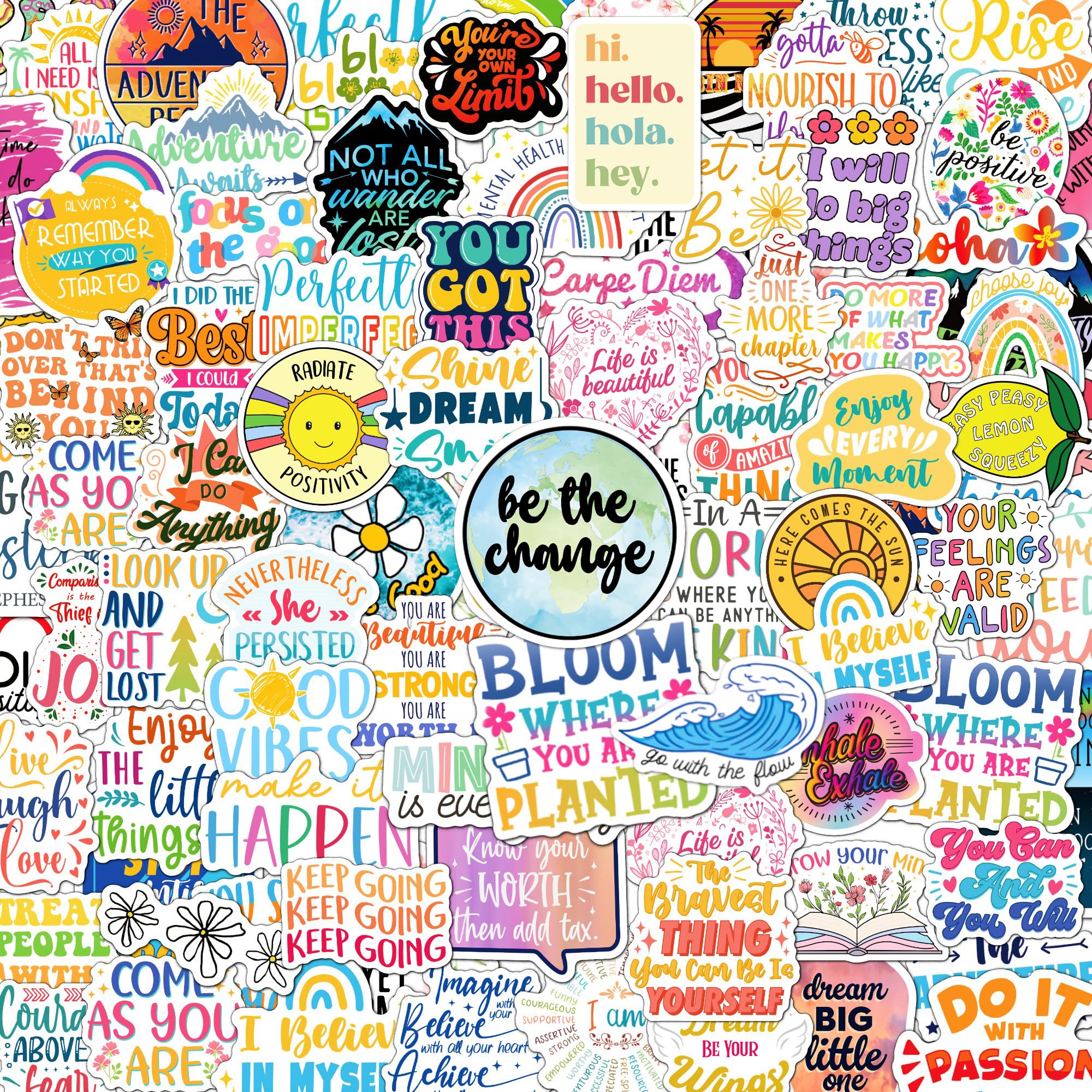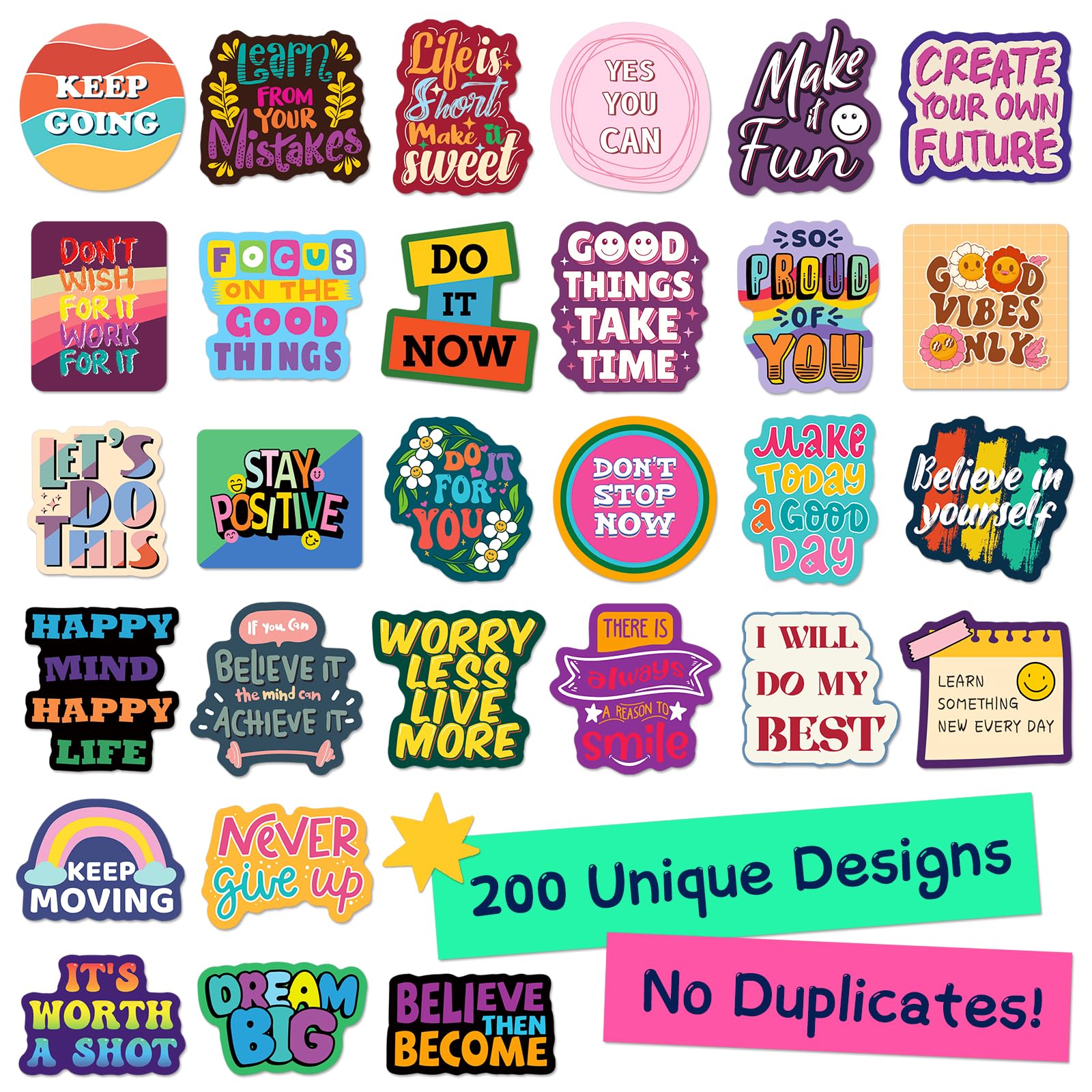 Various Positive Stickers: This set includes 200 unique motivational stickers with inspirational messages, meant to uplift and encourage. Each encouraging sticker has a distinct design, with no repeats, making it perfect for decorating your belongings while spreading positivity.