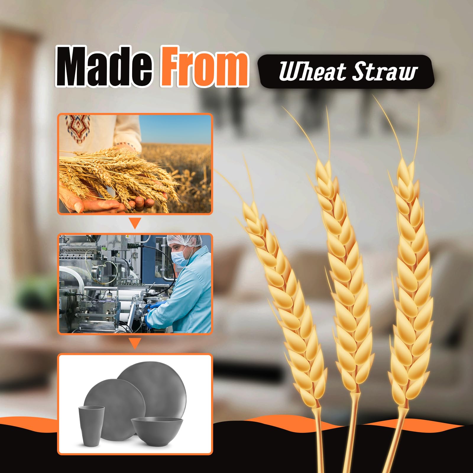 MATERIAL: Made of wheat straw and plastic material. 100% BPA free. Sturdy, will not break or chip like porcelain or ceramic.