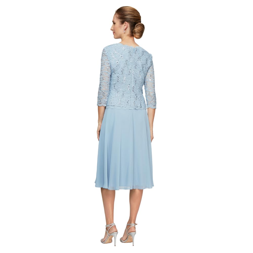 STYLING: This tea-length mock dress provides a timeless yet elegant look for any Mother of the Bride or wedding guest. The embroidered lace bodice is adorned with shimmering sequins throughout, ensuring you sparkle at your special event.