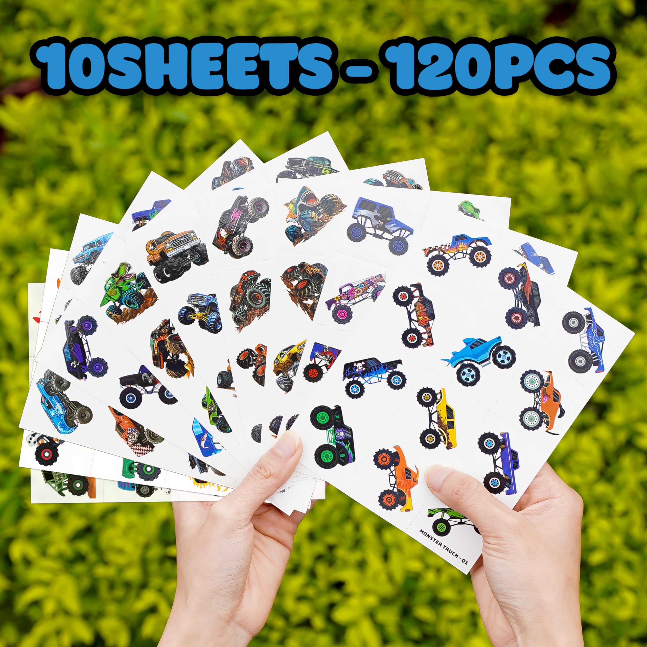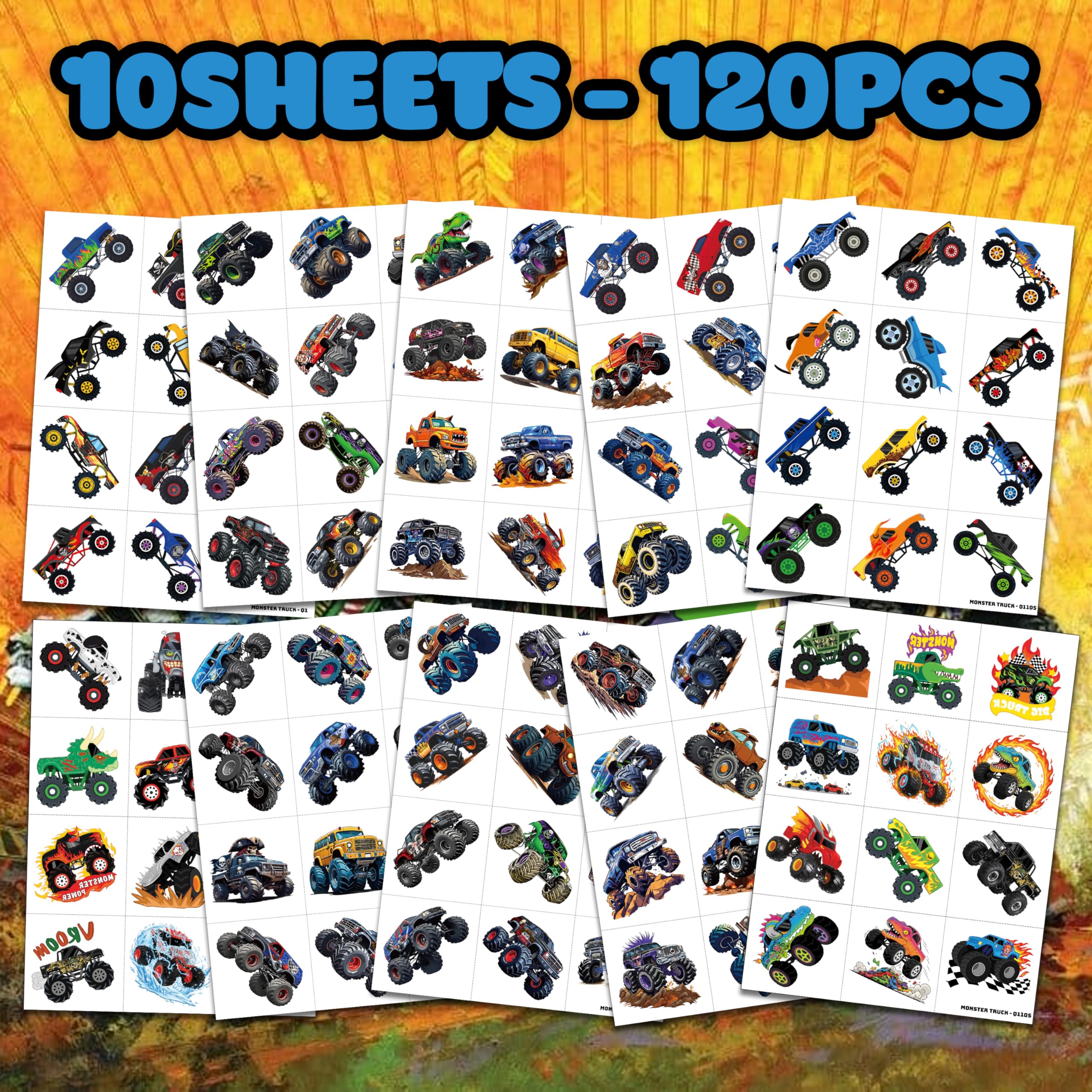 Package Includes: 10 Sheets Monster Truck Trucks Car Race Racing Car Pre-Cut temporary tattoo, total 120 PCS different designs tattoos stickers. The sheets measures 6.3 inch X 4.7 inch, one size fit all adult and kids. Can meet most of your needs.