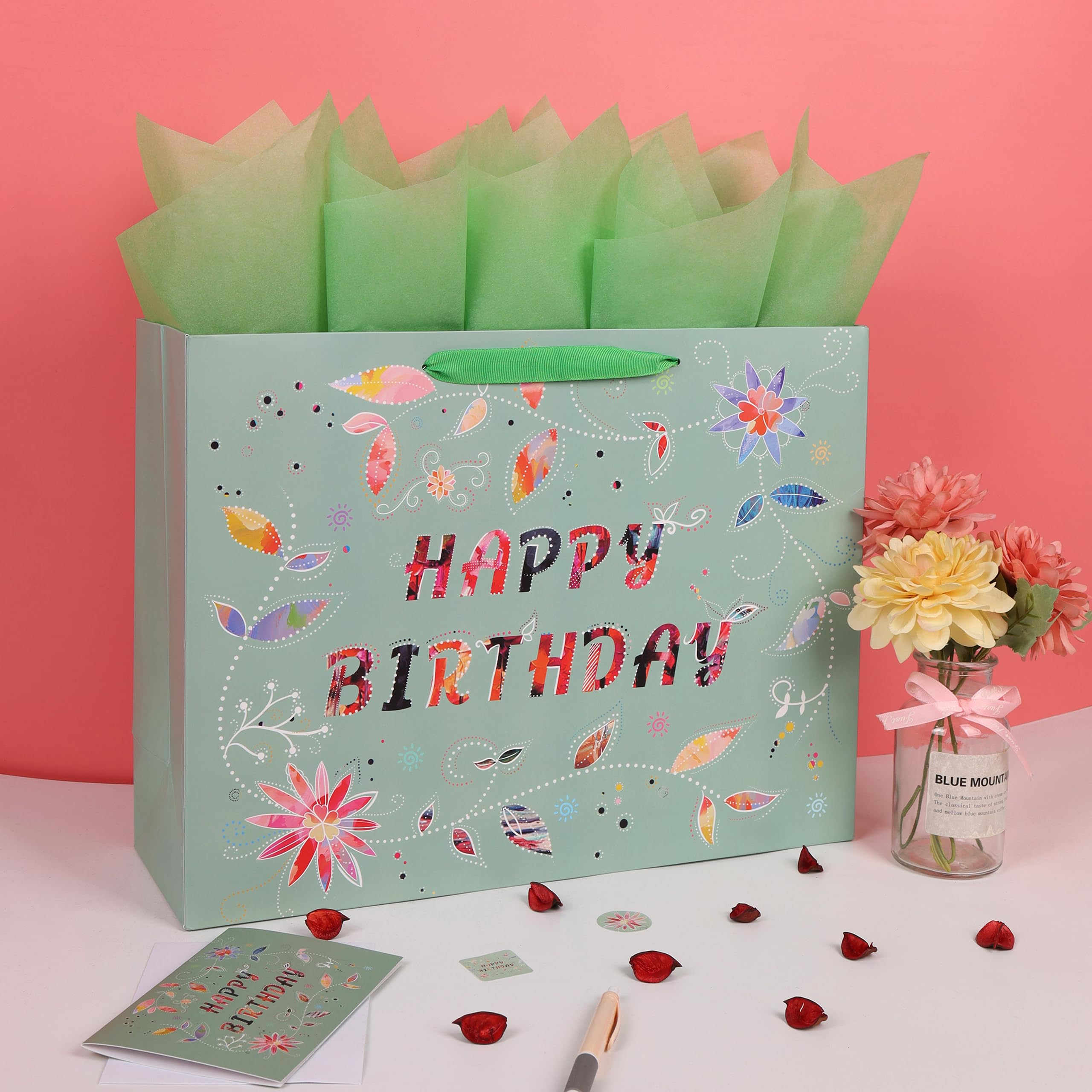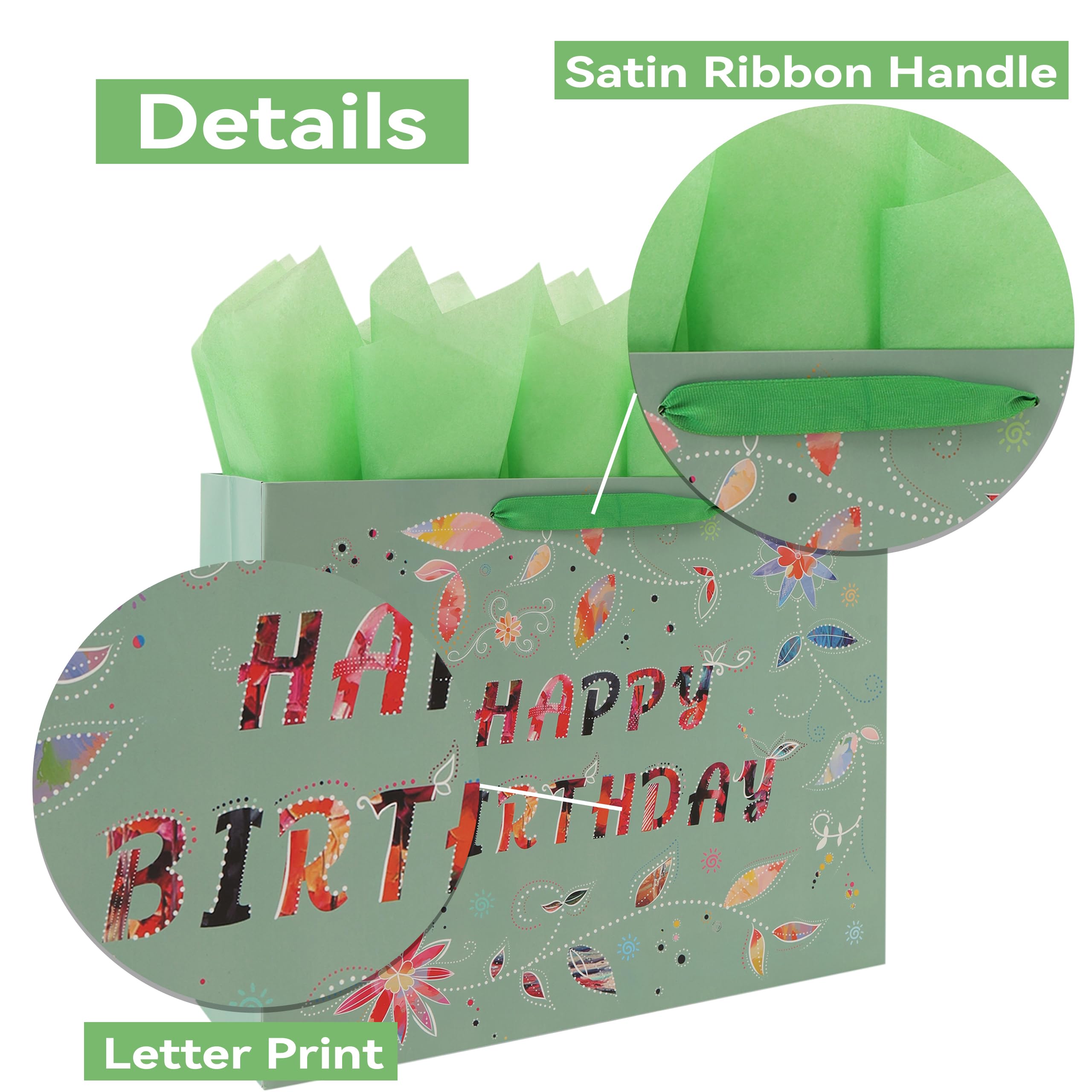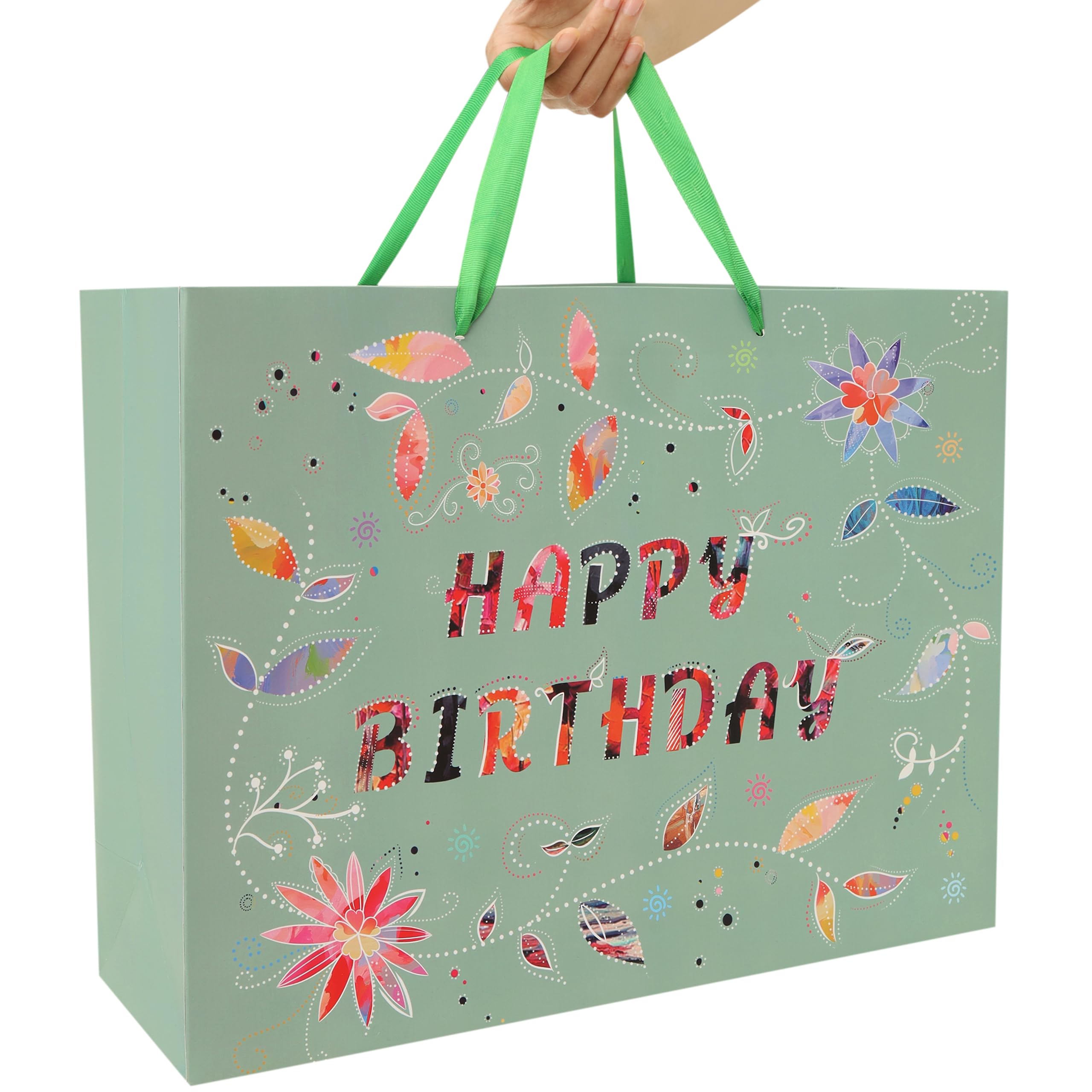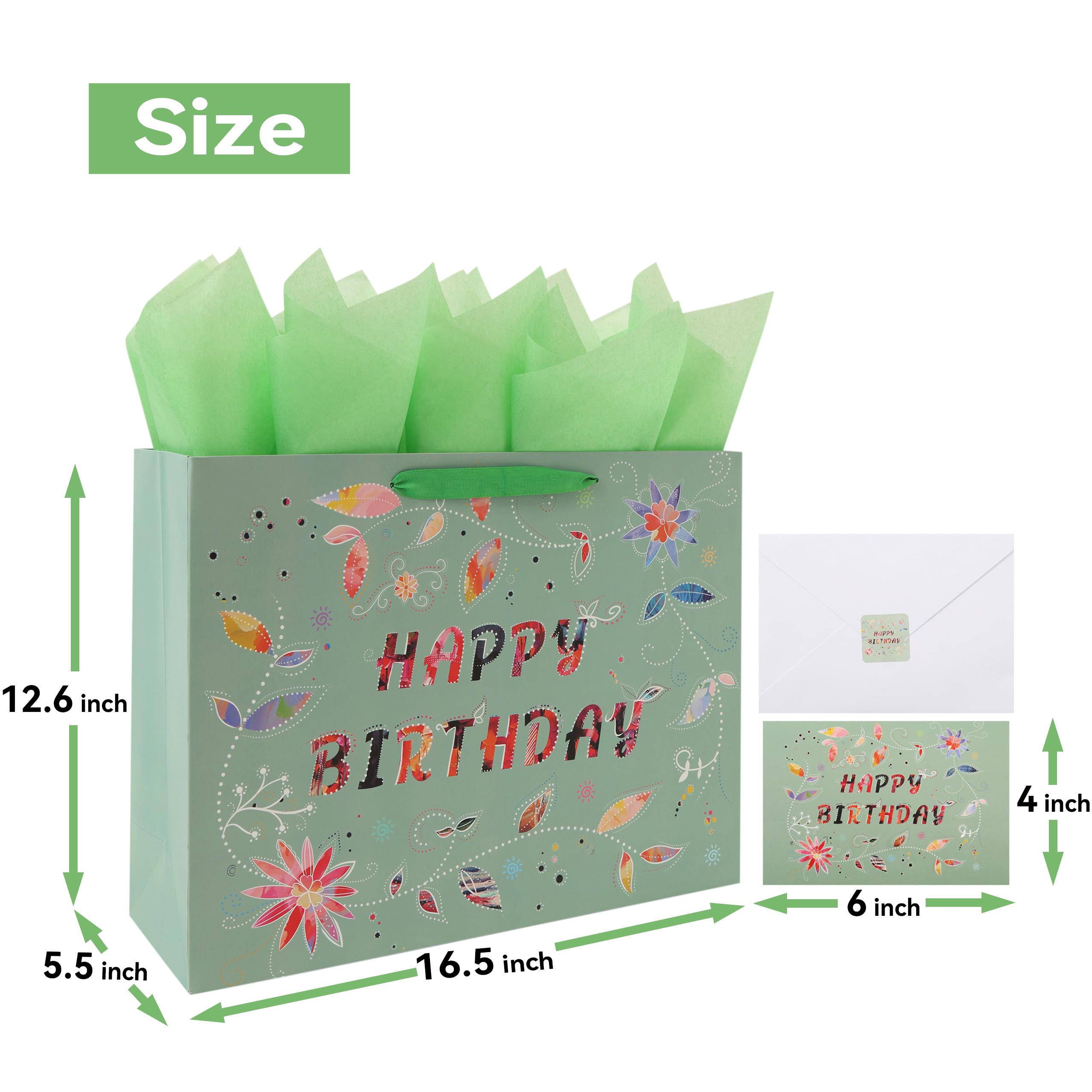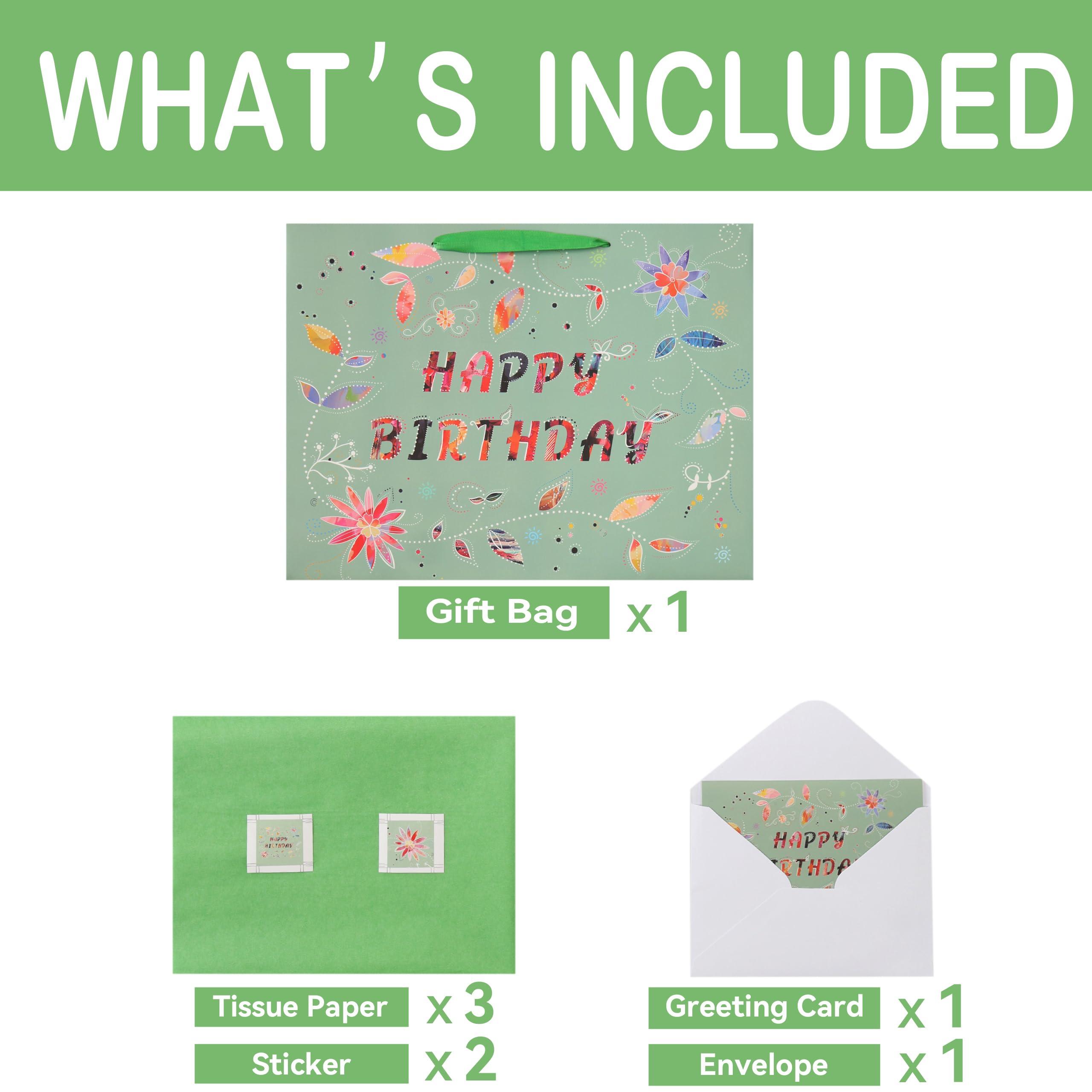 DISTINCTIVE DESIGN:The gift bag showcases an elegant “HAPPY BIRTHDAY” message, intricately designed with a combination of floral patterns and vibrant colors. Each letter of the message features colorful and patterned cut-outs, creating a unique and eye-catching effect. ULTIMATE PACKAGE:The package includes 1 extra large gift bag, 3 sheets of green tissue paper for easy wrapping or decoration, and 1 greeting card of the same design with an accompanying envelope, enabling you to convey your sincere desires. Additionally, 2 stickers are included to enhance the sense of ceremony in your gift-giving experience. VERSATILE USE: This lovely gift bag is perfect for enhancing the atmosphere at birthday parties. It's guaranteed to bring joy to women, girls, friends, partners, colleagues and mothers, making it an ideal choice for celebrating birthdays and other significant moments with loved ones. OPTIMAL SIZE:Measuring 16.5” L x 5.5” W x 12.6” H, this sturdy large gift bag is perfectly sized for holding electronic devices, smartphones, tablets, clothing, shoes, handbags, designer accessories, and more. It's versatile for gifting various items like chocolates, necklaces, bracelets, earrings, rings, books, art supplies, sports equipment, or cooking utensils. ECO FRIENDLY AND PREMIUM QUALITY:These eco-friendly gift bags are expertly crafted from high-quality paper materials, sourced from responsibly managed forests, ensuring both style and sustainability.