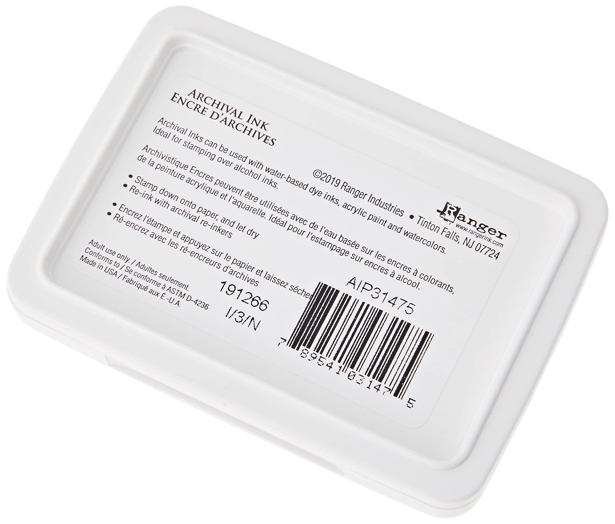 The ink pads provide lasting results. They will not deteriorate paper or precious photographs, they will not bleed when painted or brayered over with watercolors, water-based inks, markers or pearl pigments. These inks are fade resistant, water resistant, acid free, non-toxic and permanent for paper-heat set for permanence on non-porous surfaces. These pads feature removable hinged lid, raised stamping surface, and measure 2.75x4 inches. This package contains one Ranger Archival Ink Pad #0. Available in a variety of colors, each sold separately. Made in USA.