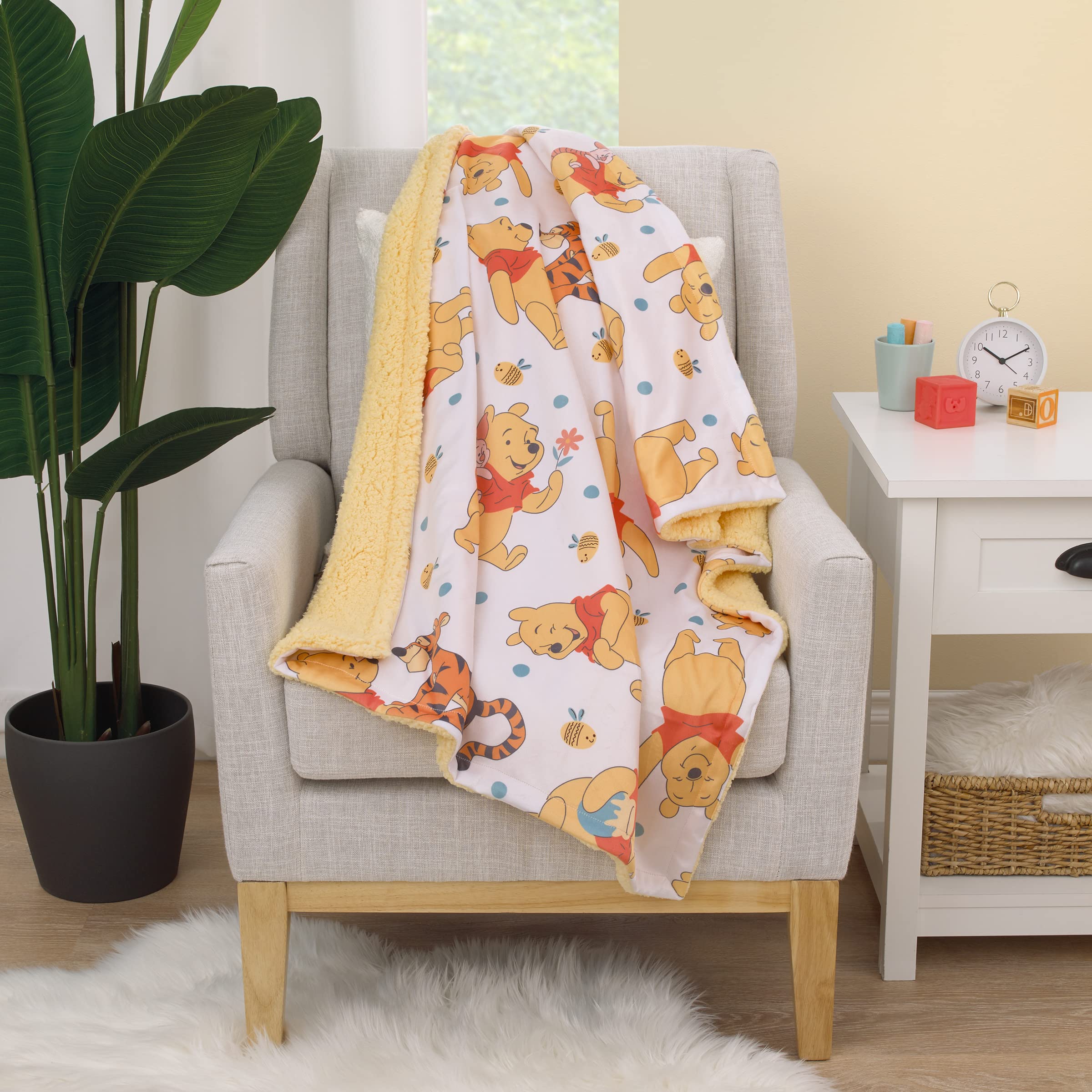 This sherpa baby blanket features Winnie the Pooh, Piglet and Tigger!