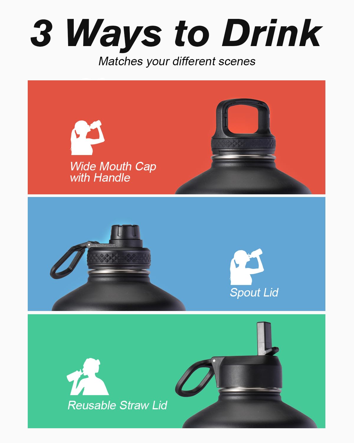 Flexible Drinking On-the-Go: This water jug comes with 3 different lids. The screw-on lid with flip-up handle is for easy ice refilling with superior portability; spout lid makes it convenient to drink hot liquid and straw lid for sipping cold.