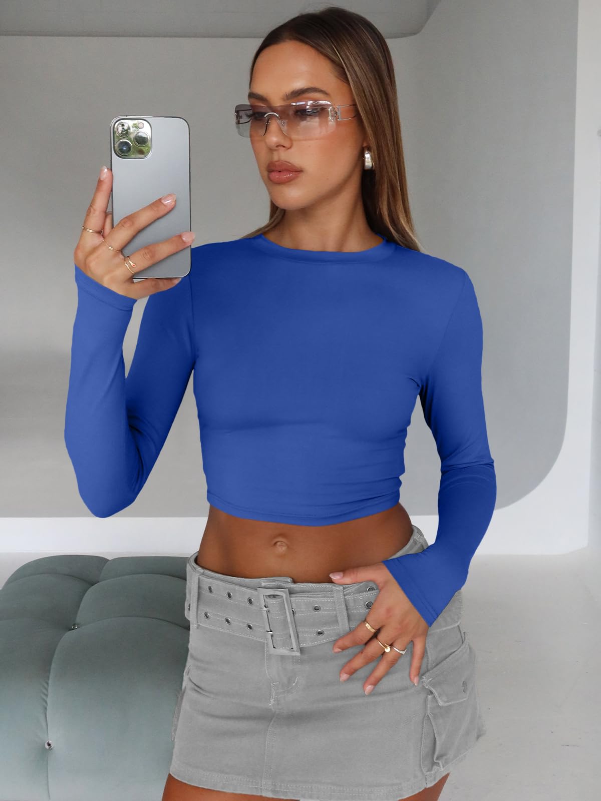 Y2k Design: Cropped and regular style,you can wear it regularly or fold it up like a crop top.cute,slim fitted,casual style,scoop neck,long sleeve shirts.