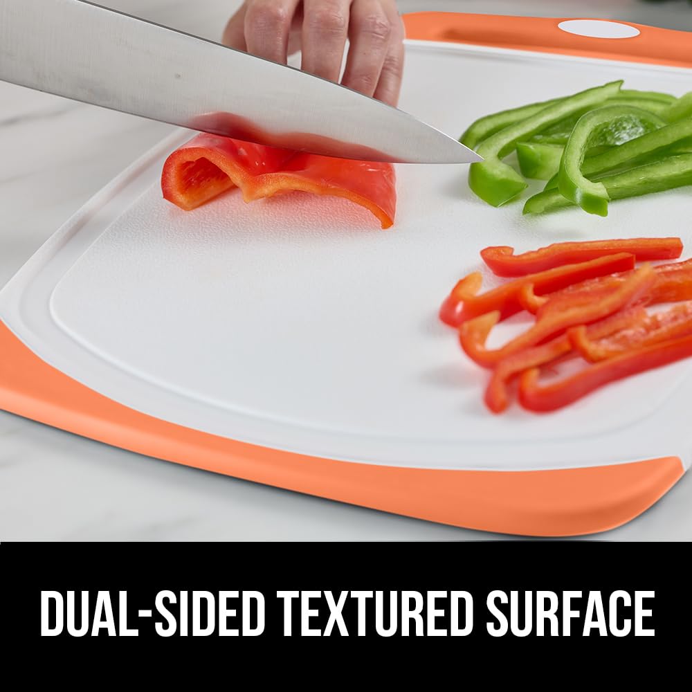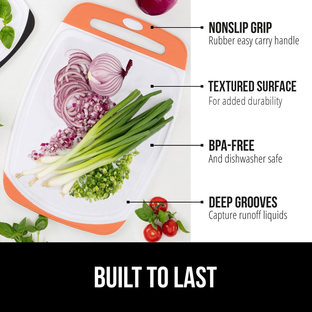 ULTRA DURABLE AND BUILT TO LAST: unlike wood or bamboo, these thick, nonporous boards are incredibly durable; won’t splinter, crack or peel, even after many washes; no oiling or maintenance necessary; deep juice grooves help capture runoff liquid from messy ingredients; rubber border helps provide a secure grip on countertops; food grade and a great choice for all homes