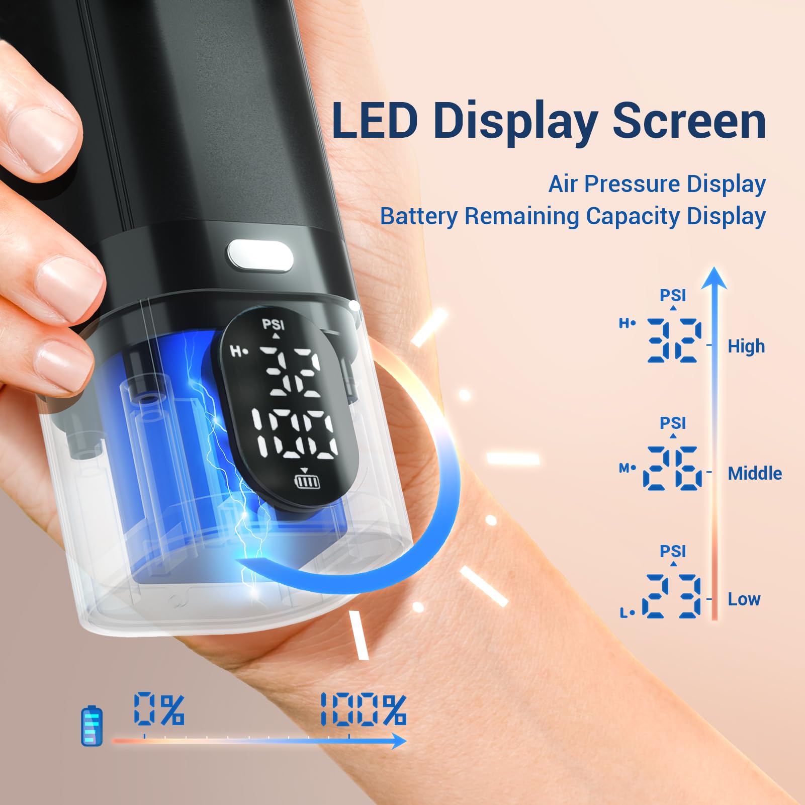 【LED Display】With a LED display screen on the airbrush compressor, it will show the battery remaining capacity and the real-time air pressure. It can help you charge the compressor in time to prevent that power runs out before project is finished
