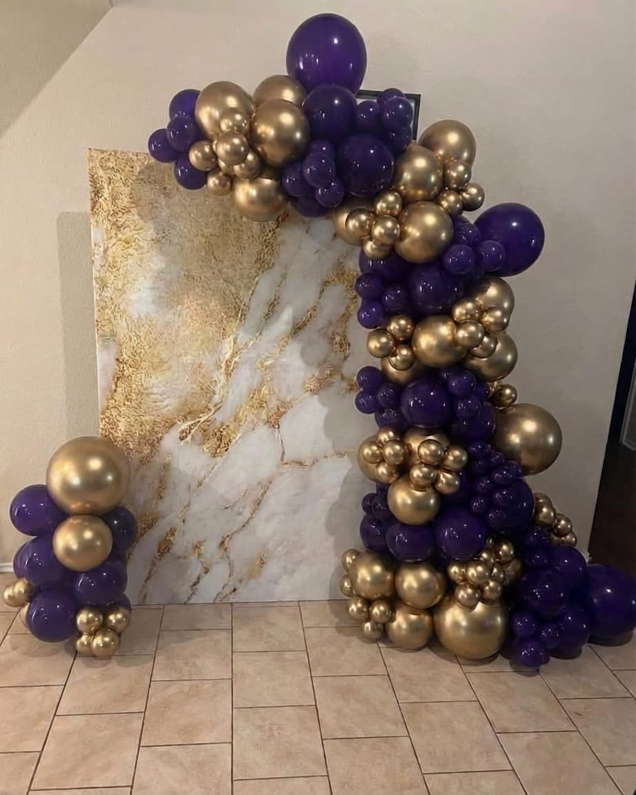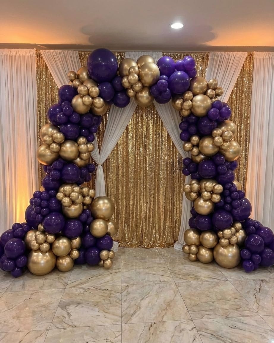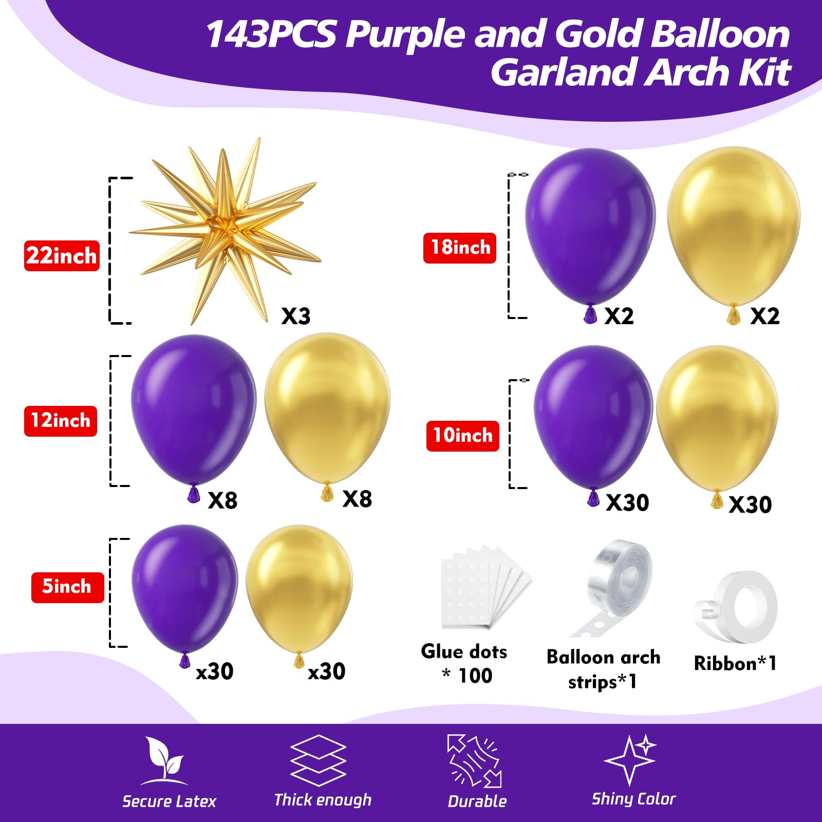 PURPLE AND GOLD BALLOONS ARCH KIT: HKYOOD balloons kit total 144pcs balloons, dark purple balloons (18" 2pcs, 12" 8pcs 10" 30pcs, 5" 30pcs), metallic gold balloons (18" 2pcs, 12" 8pcs 10" 30pcs, 5" 30pcs), explosion star foil balloons (22" 3pcs). Dot glue 20*5PCS, balloon garland strip*1