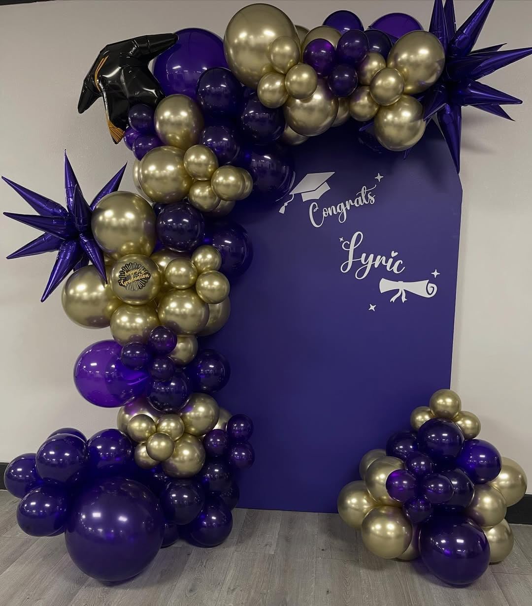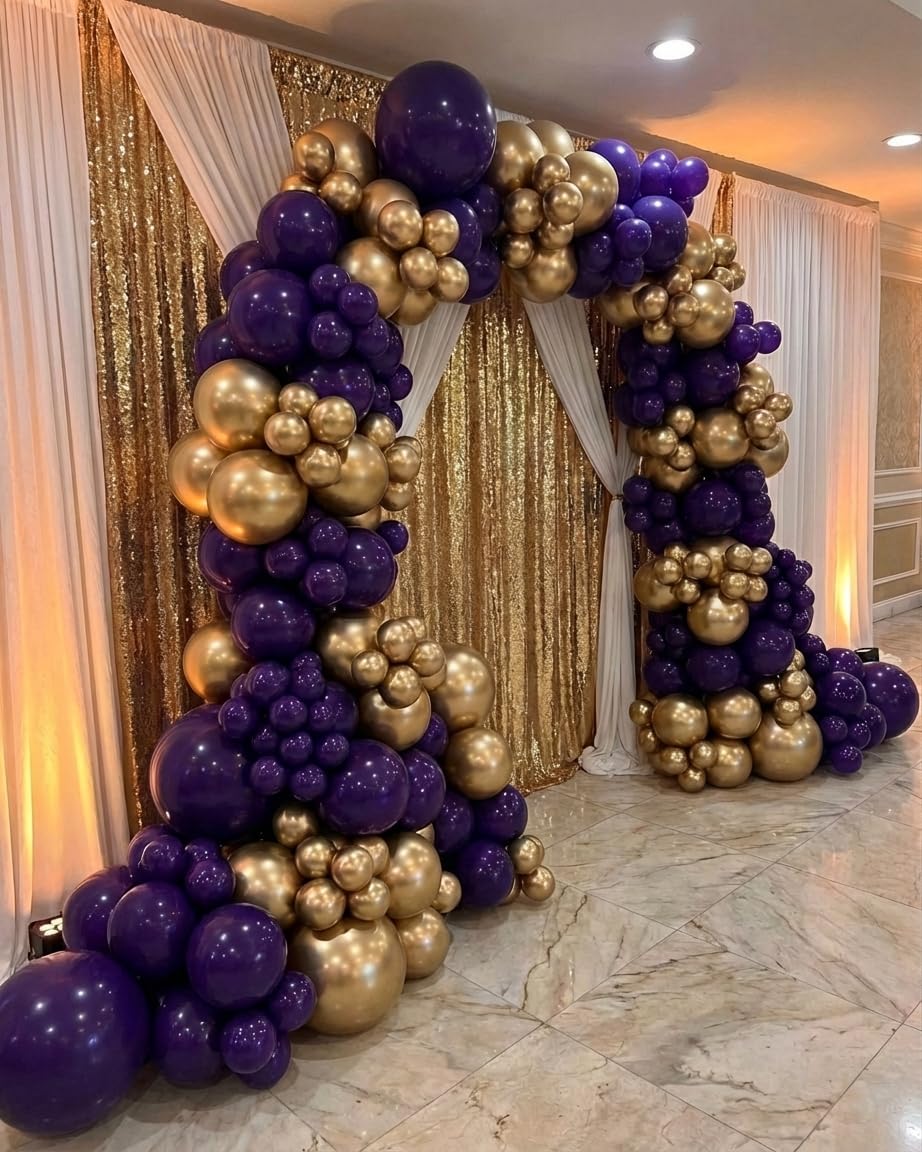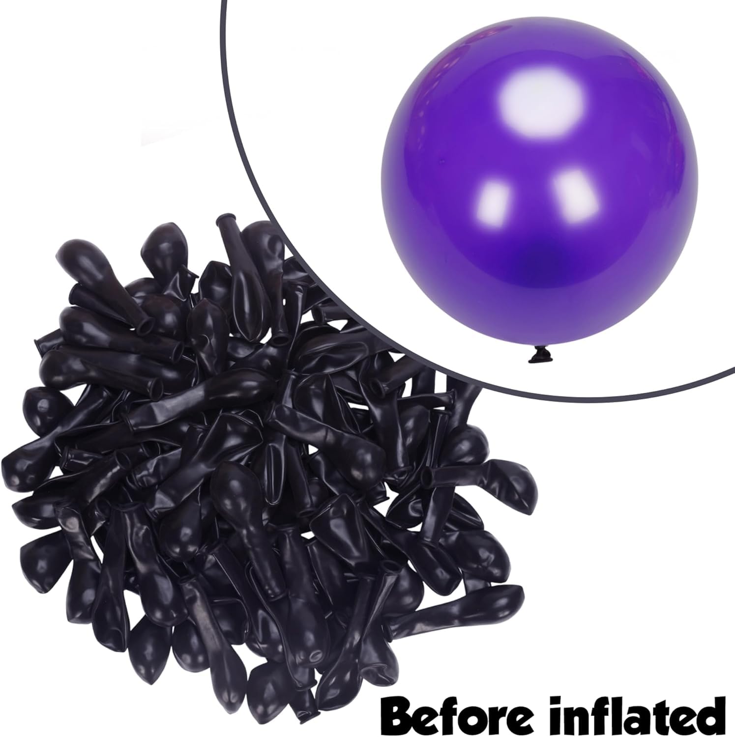 PURPLE AND GOLD BALLOONS ARCH KIT: HKYOOD balloons kit total 144pcs balloons, dark purple balloons (18" 2pcs, 12" 8pcs 10" 30pcs, 5" 30pcs), metallic gold balloons (18" 2pcs, 12" 8pcs 10" 30pcs, 5" 30pcs), explosion star foil balloons (22" 3pcs). Dot glue 20*5PCS, balloon garland strip*1
