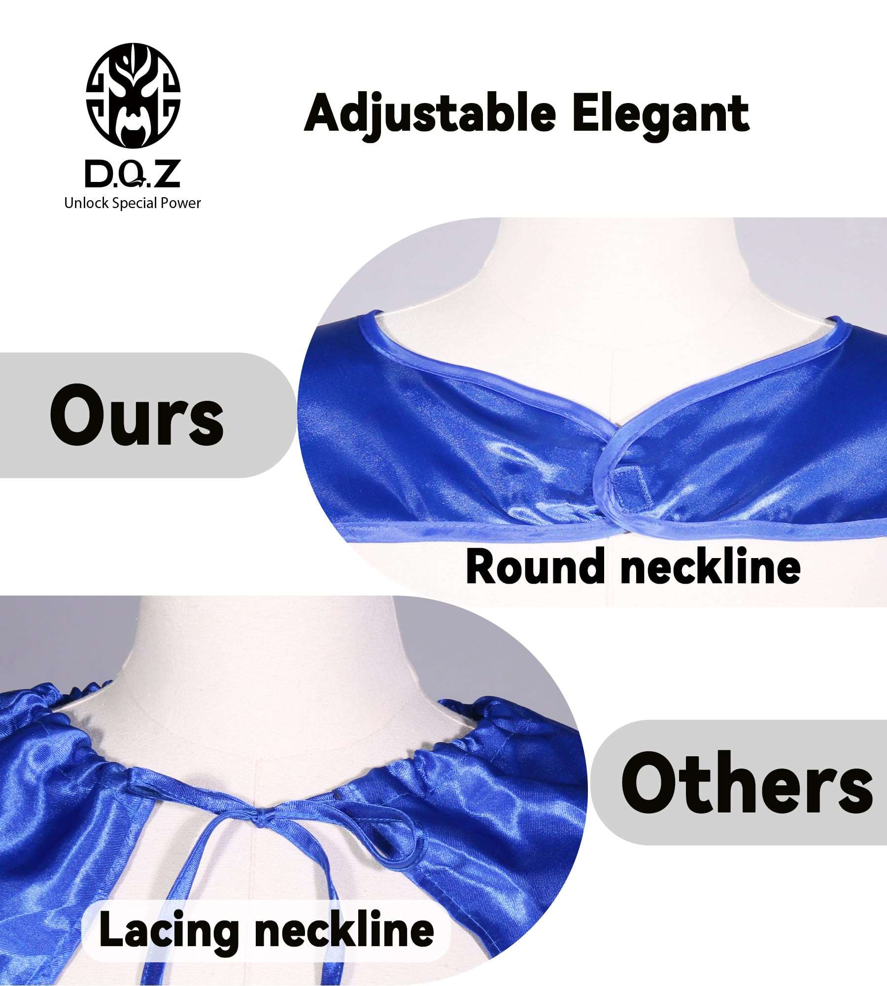 Adjustable Neckline: Round neckline with adjustable Hook and loop fastener, is more comfortable and elegant. It is easy for you to wear this superhero cape whatever occasions you are.